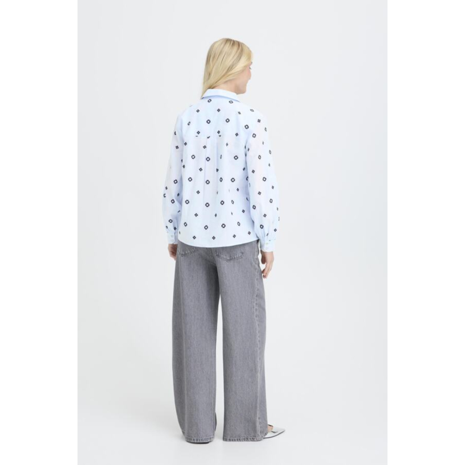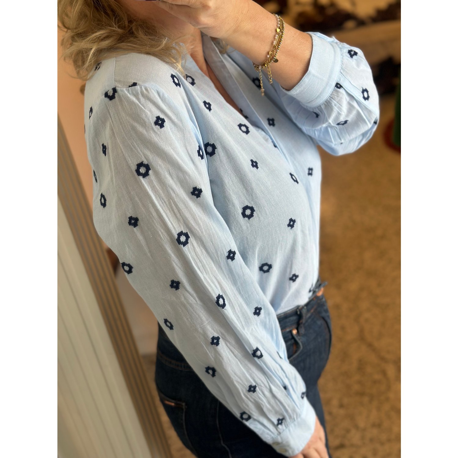 Omschrijving: De B.young BYFabienne blouse in lichtblauw heeft een verfijnde uitstraling door de donkerblauw geborduurde tekens. De V-hals met kraag en de ballonmouwen geven de blouse een vrouwelijke, modieuze look. Comfortabel en stijlvol, perfect te combineren met een jeans, pantalon of onder een blazer.