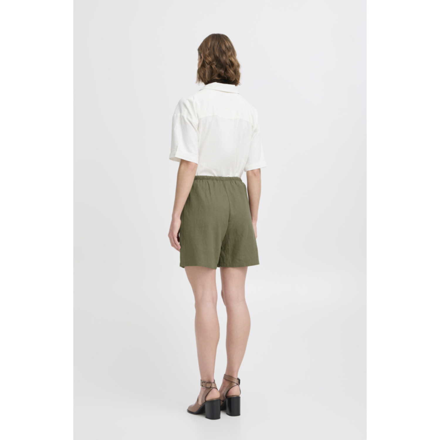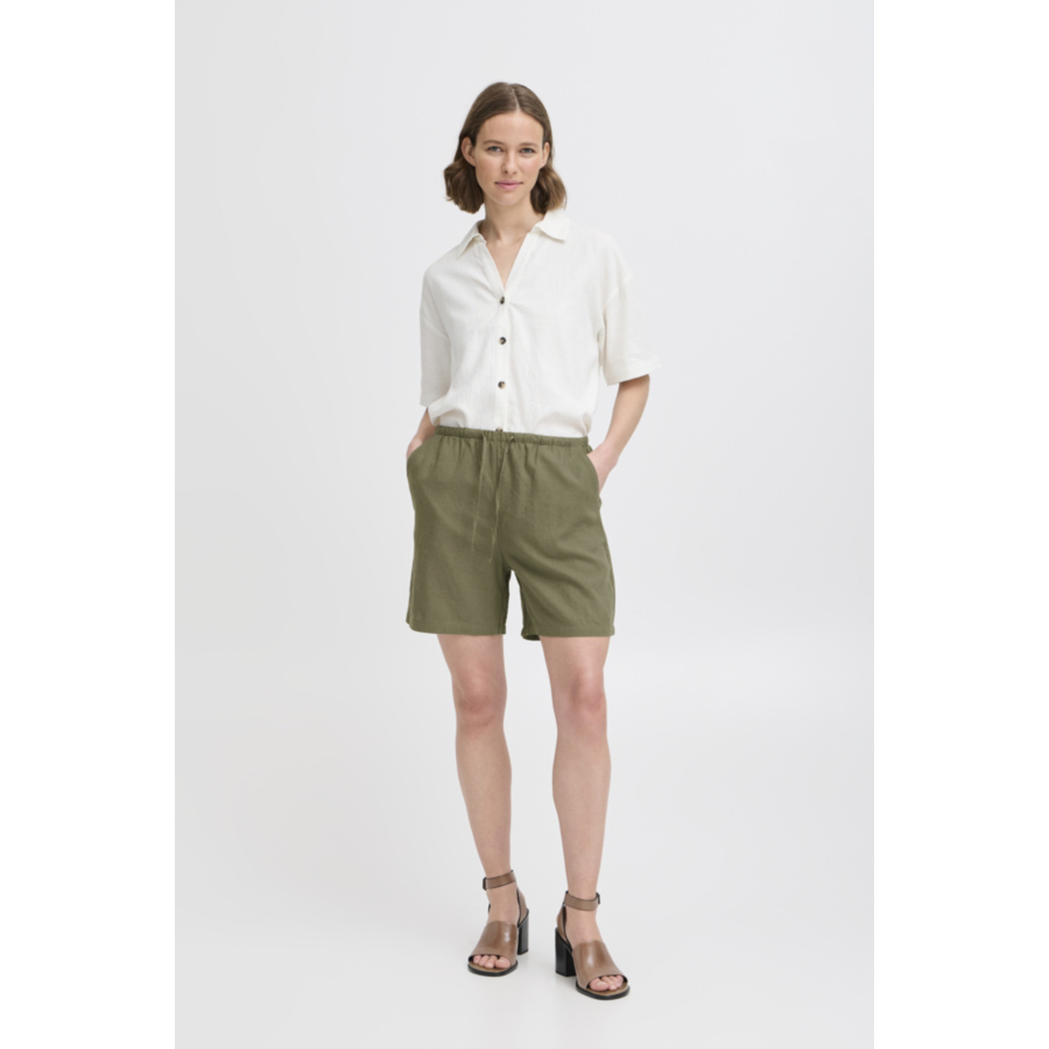 Materiaal: 55% Linen, 45% Viscose Lengte: korte lengte Pasvorm: regular fit Wasvoorschrift: 30°C fijnwas, door de viscose linnen mix een lichte krimp die je weer kunt uitstrijken Bijzonderheden: fijne zomerse short die je leuk kunt combineren met meerdere items uit dezelfde lijn Kleur fabrikant: kalamata Sluiting: elastische boord Heuphoogte: regular waist Broekzakken: steekzakken