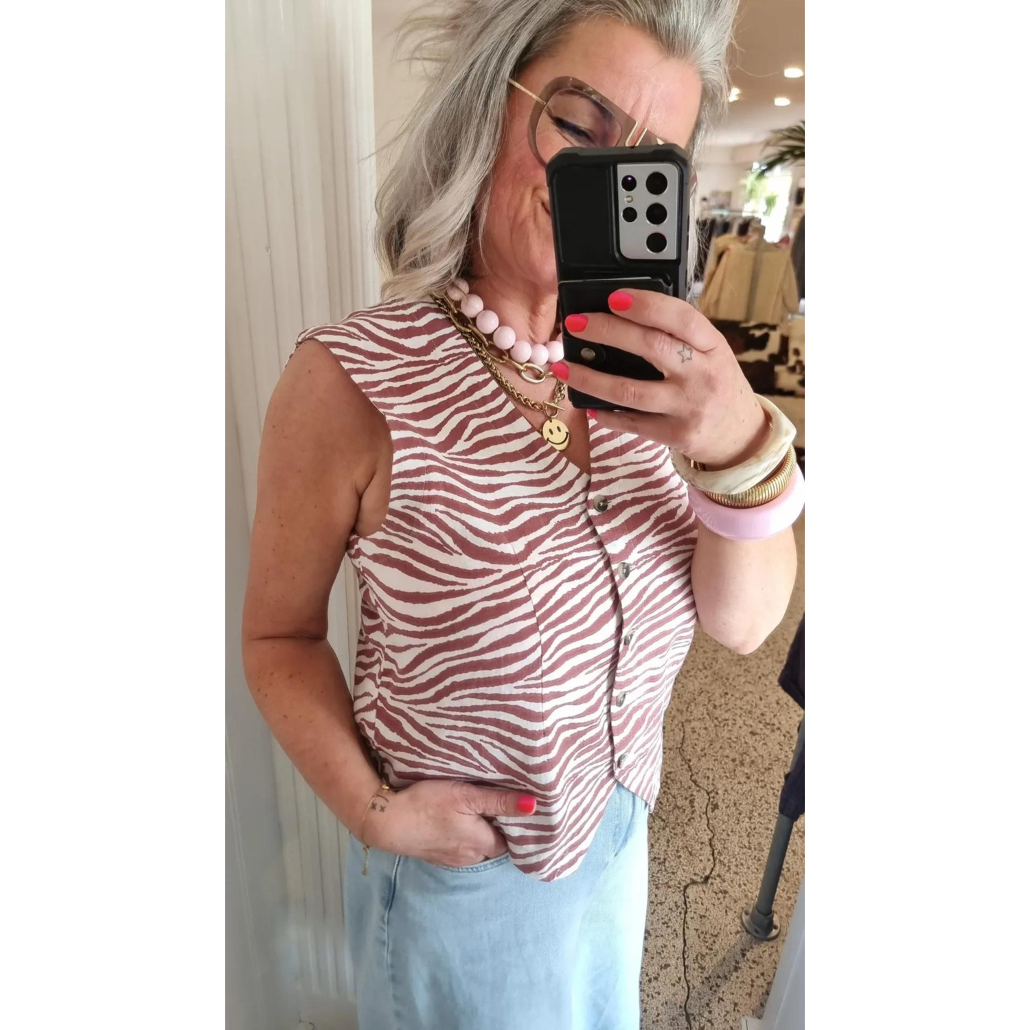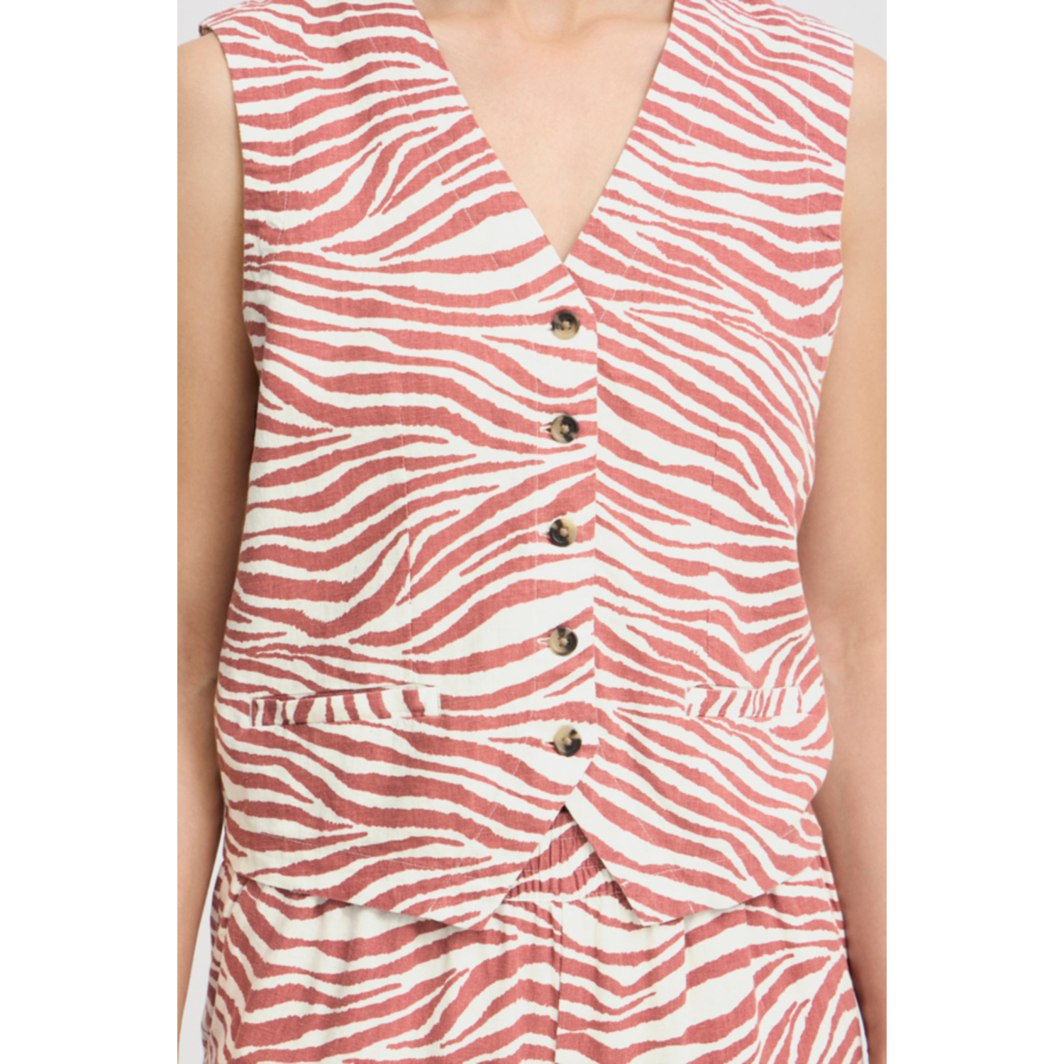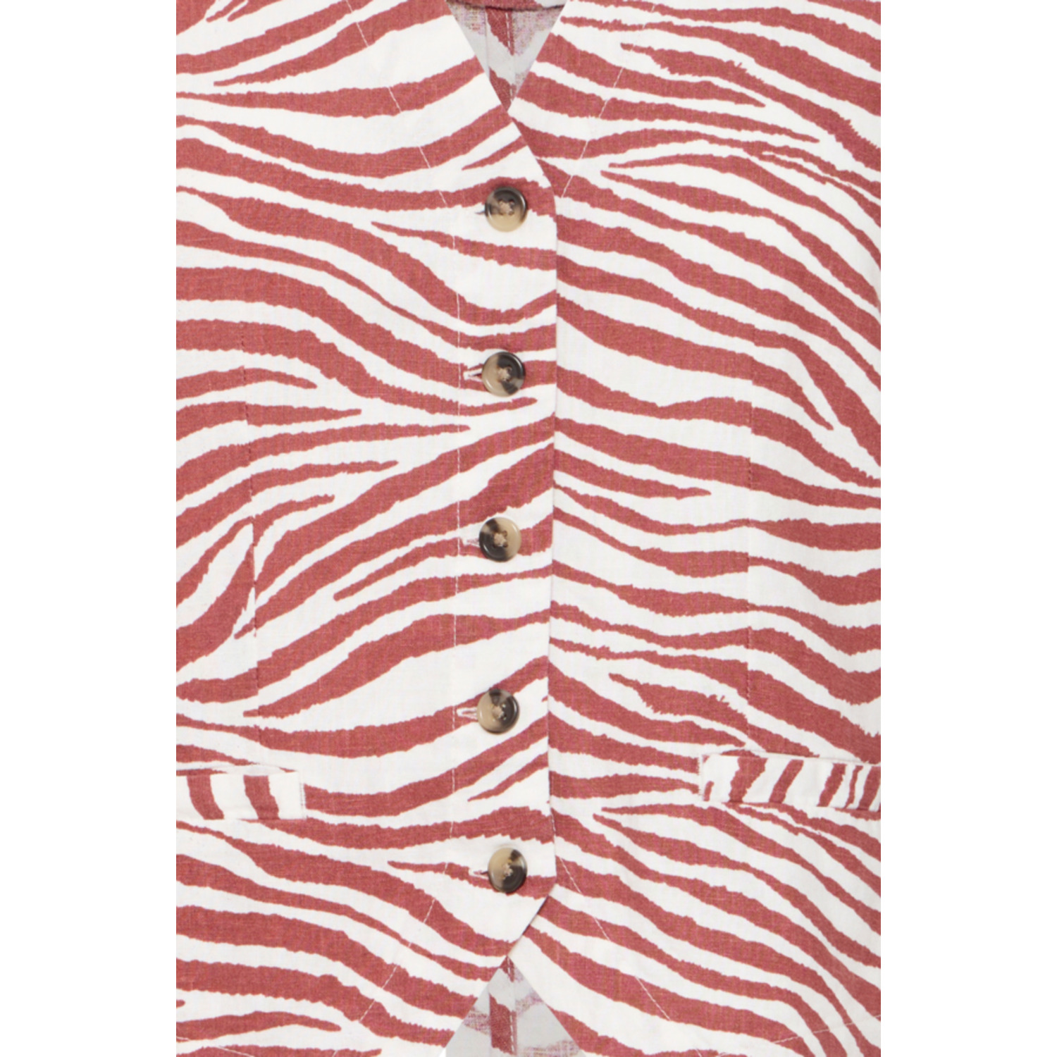 Materiaal: 55% Linen, 45% Viscose Lengte: short length Pasvorm: Regular fit Wasvoorschrift: 30°C fijnwas, door de viscose linnen mix een lichte krimp die je weer kunt uitstrijken Bijzonderheden: draag het falakka gilet samen met het bijpassende shortje voor en trendy look. Kleur fabrikant: animal light maho Halslijn: v hals Mouwlengte: mouwloos Sluiting: knopen