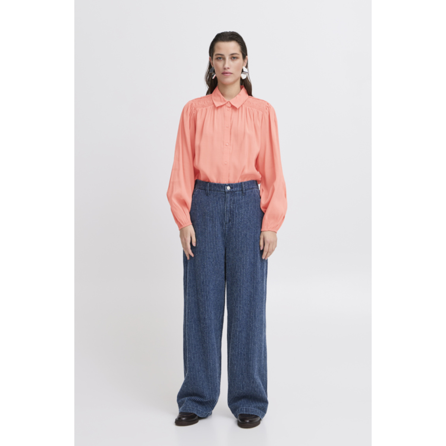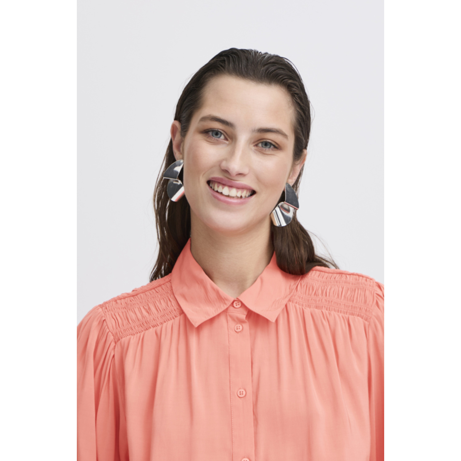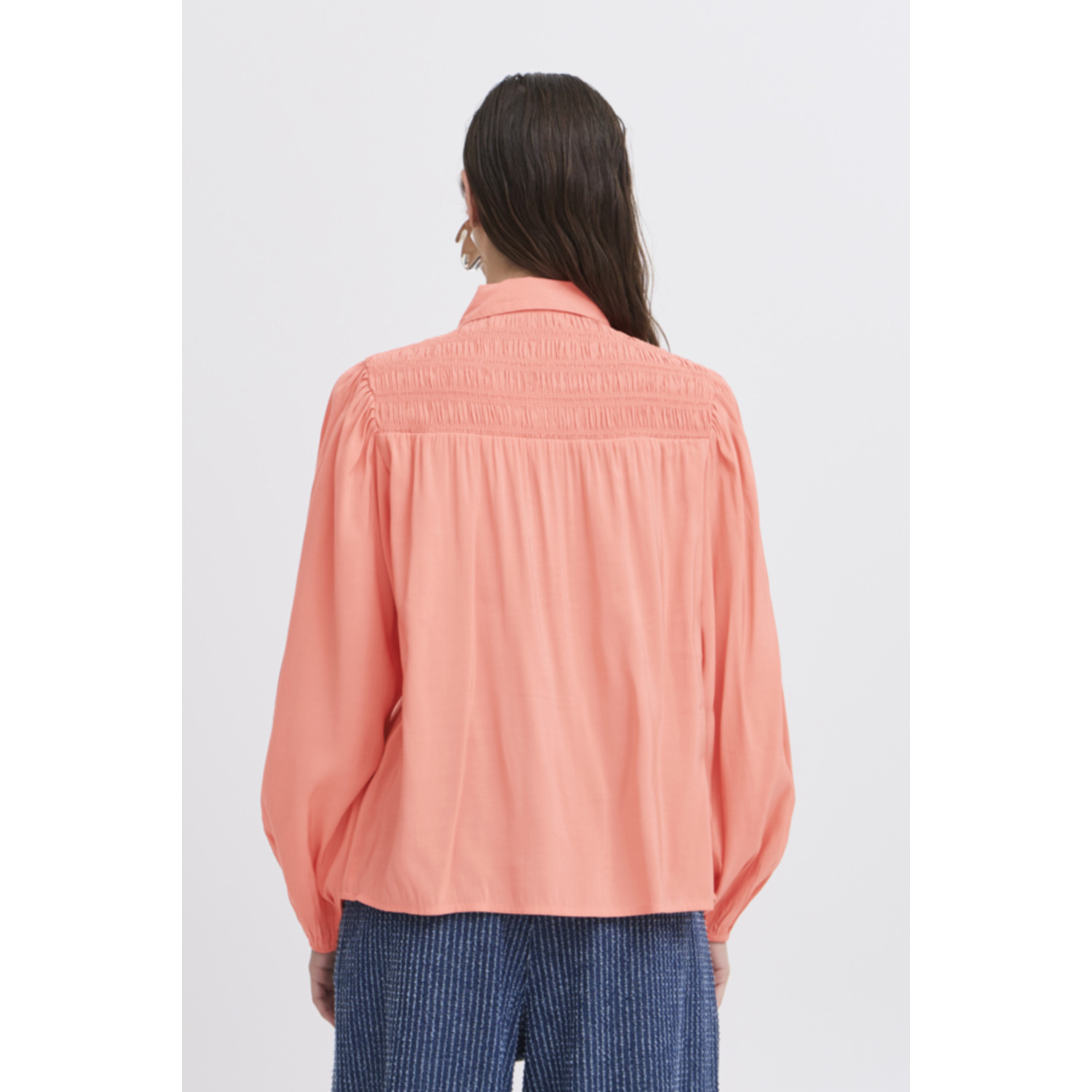 Materiaal: 84% Viscose, 16% Polyester Lengte: heup lengte Pasvorm: loose fit Wasvoorschrift: 30°C fijnwas Bijzonderheden: pech kleurige blouse met smok details bij de schouders Kleur fabrikant: Porcelain Rose Halslijn: ronde hals Mouwlengte: lange mouwen Sluiting: knoop sluiting