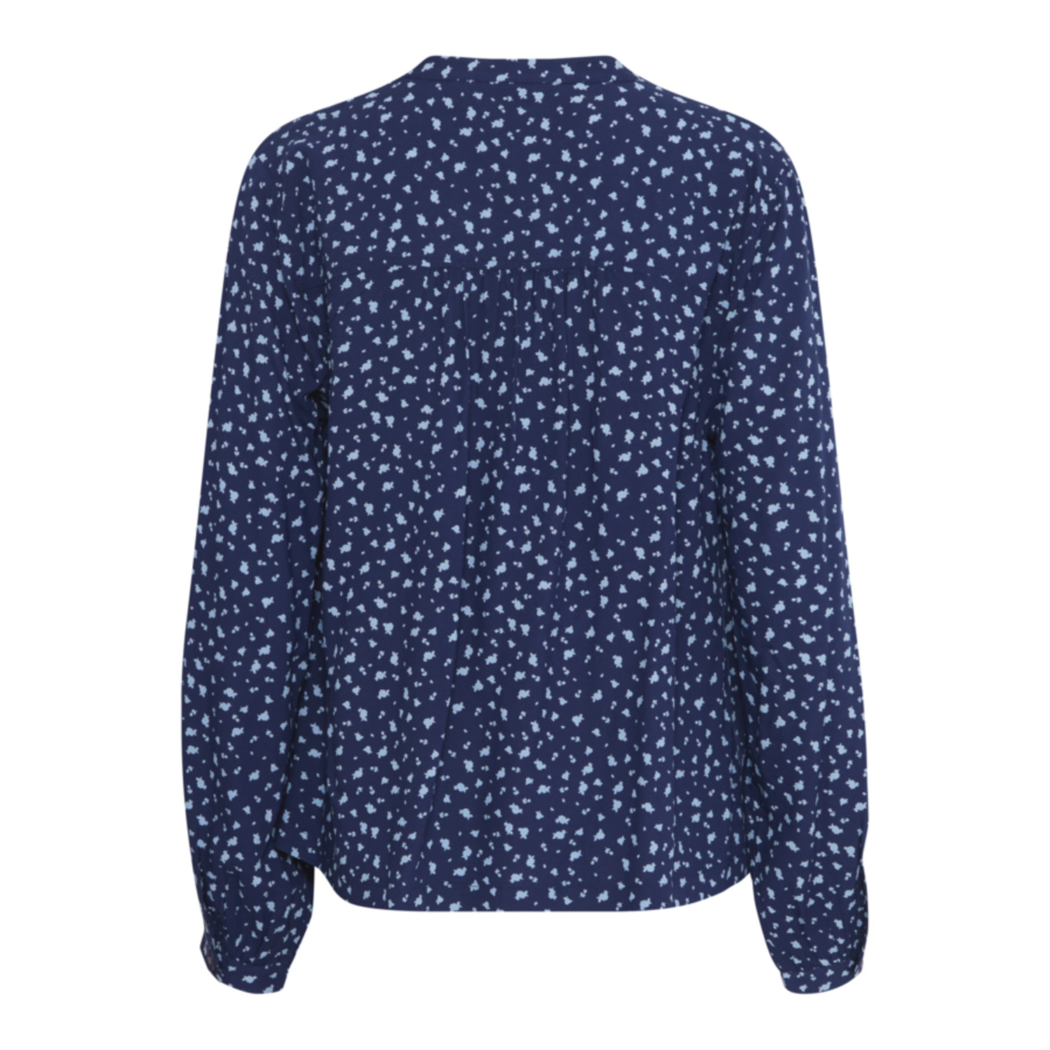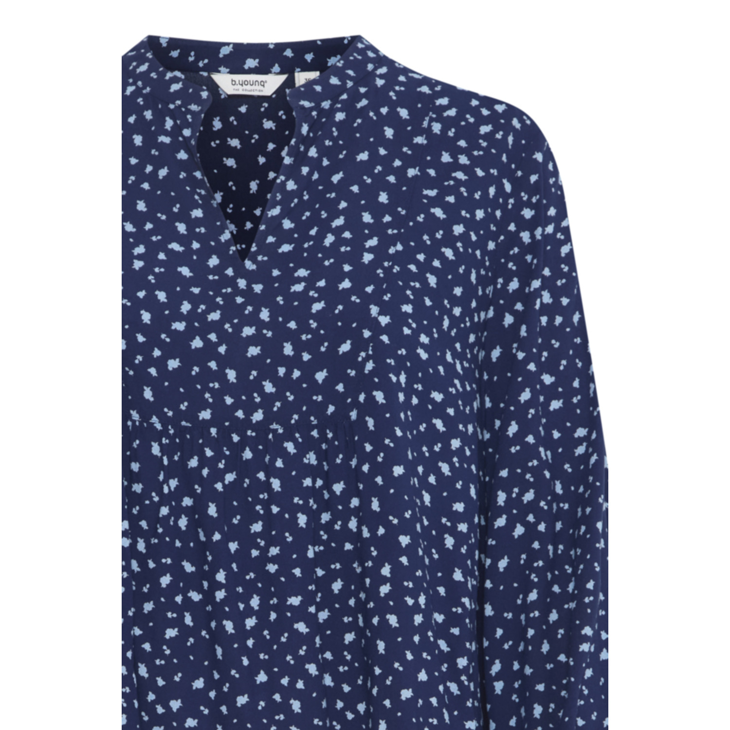 Materiaal: 100% Viscose (LivaEco™) Lengte: normale lengte Pasvorm: regular fit Wasvoorschrift: 30°C fijnwas Bijzonderheden: blauwe blouse met licht blauwe bloemetjes met smock detail Kleur fabrikant: small blue flower Halslijn: v-hals Mouwlengte: lange mouwen