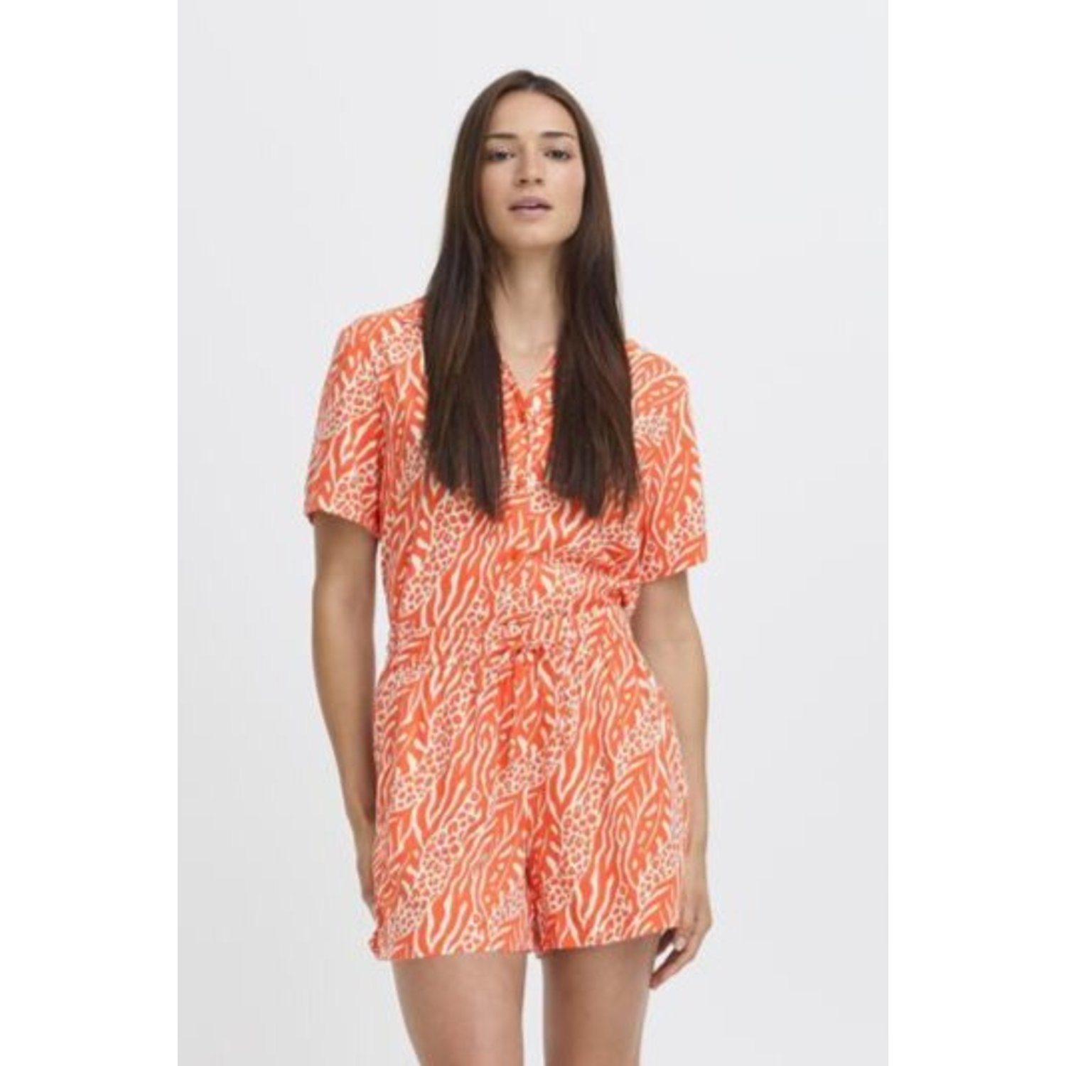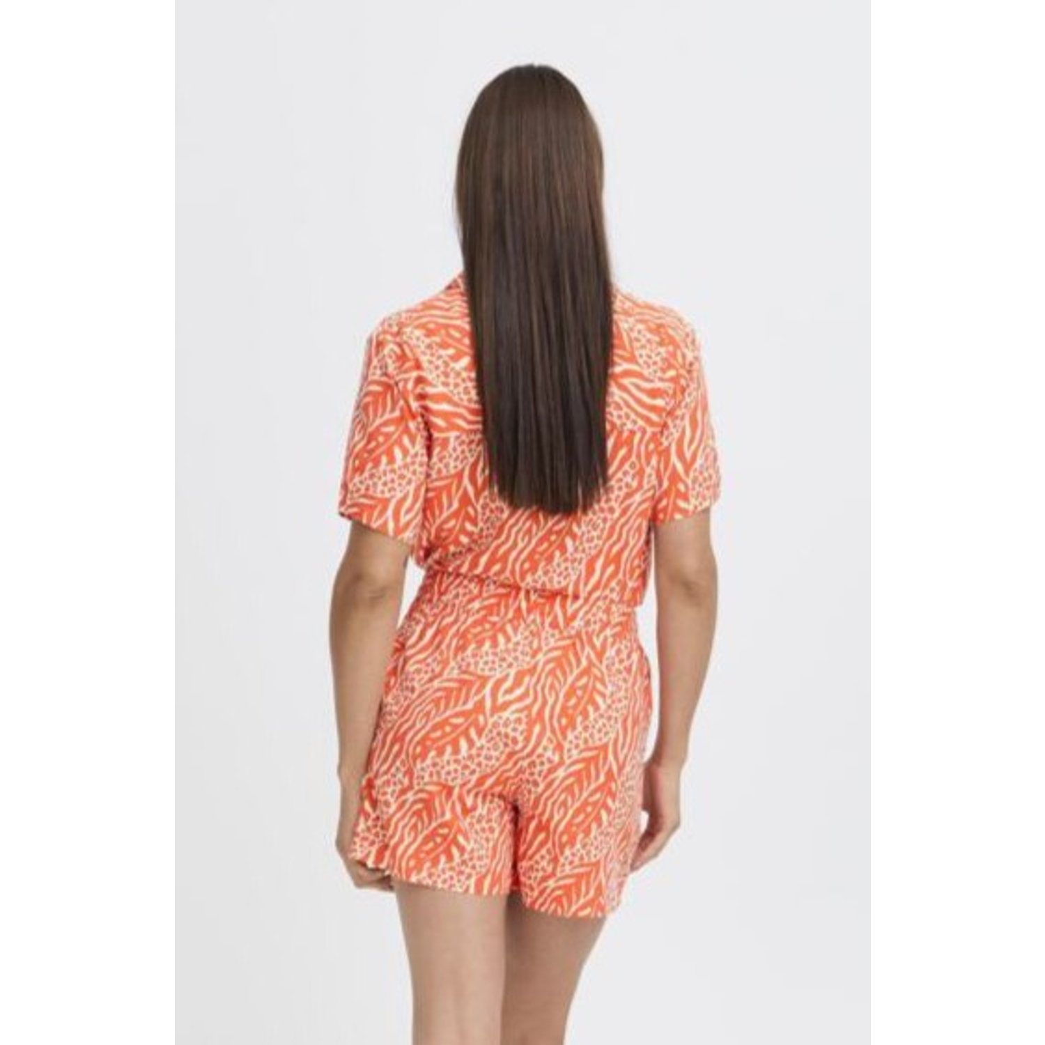 Omschrijving: De B.young BUMmjoella Shorts in oranje print is een luchtige en comfortabele korte broek, perfect voor warme dagen. Gemaakt van een soepele viscose stof die fijn draagt. De elastische tailleband zorgt voor een mooie pasvorm en extra comfort. Leuk te combineren met het bijpassende shirt voor een complete en zomerse set.