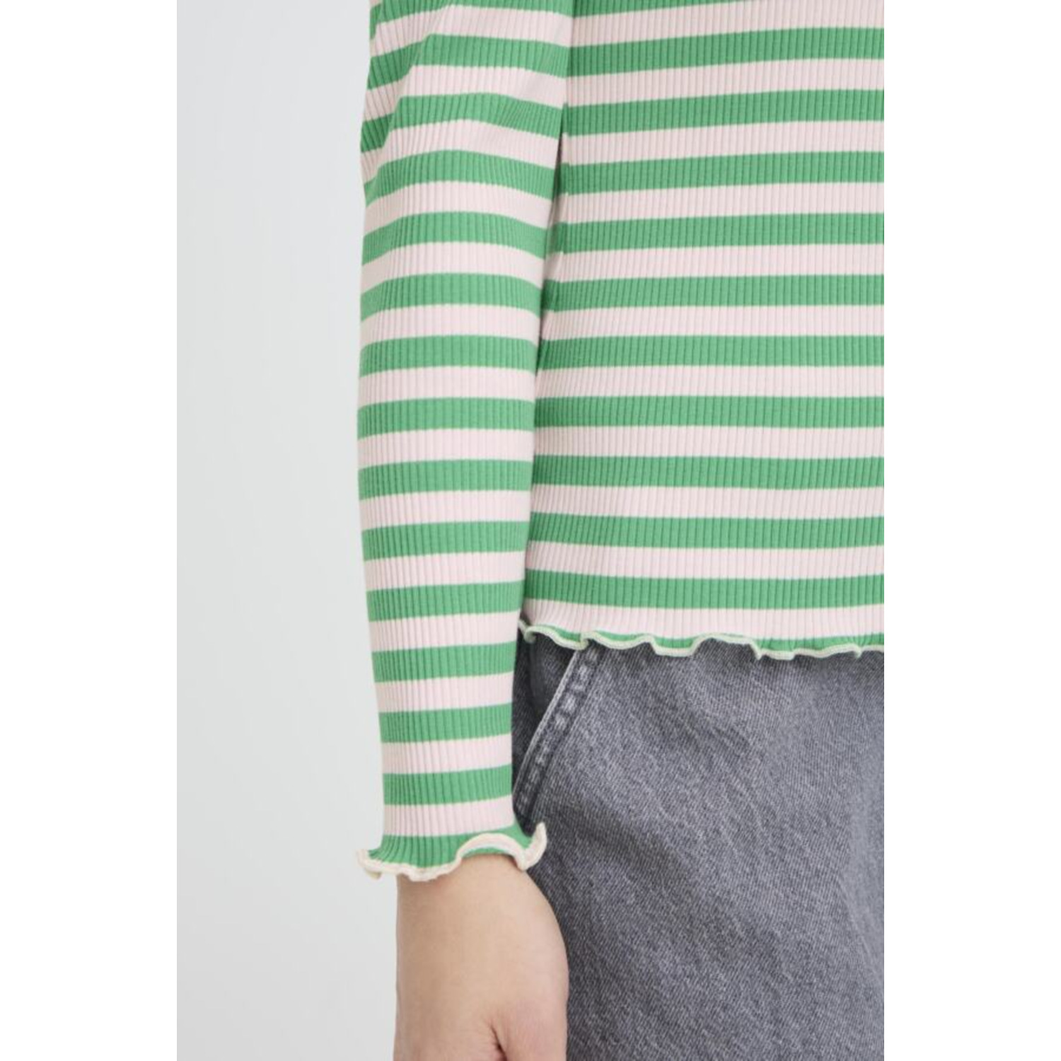 Omschrijving: Het B.young BYSinne Rib Shirt is een groen-wit gestreept shirt met lange mouwen en een zachte ribstructuur. De roze ronde hals geeft dit item een speelse, vrouwelijke twist. Comfortabel om te dragen en perfect als basic met nét dat beetje extra, mooi op een jeans, pantalon of onder een blazer.