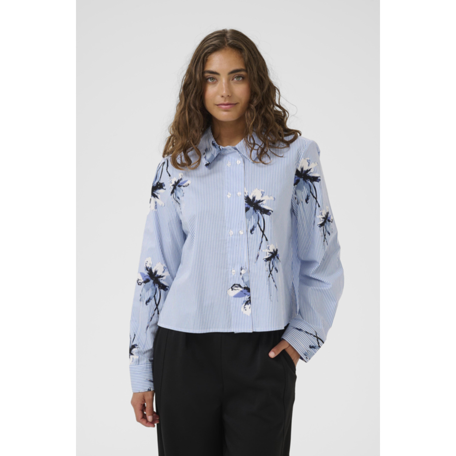 Omschrijving: De Culture CUbrila blouse in blauw is een frisse en vrouwelijke blouse met een speelse uitstraling. Het blauw gestreepte dessin wordt gecombineerd met een subtiele blauwe bloemenprint, wat zorgt voor een mooi contrast. De blouse valt soepel en is perfect te stylen met jeans of een nette broek.
