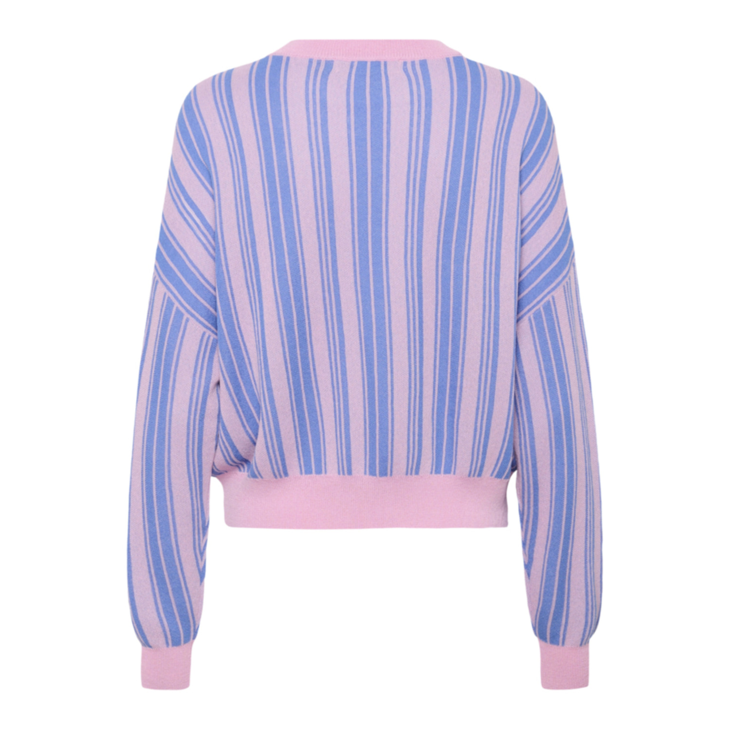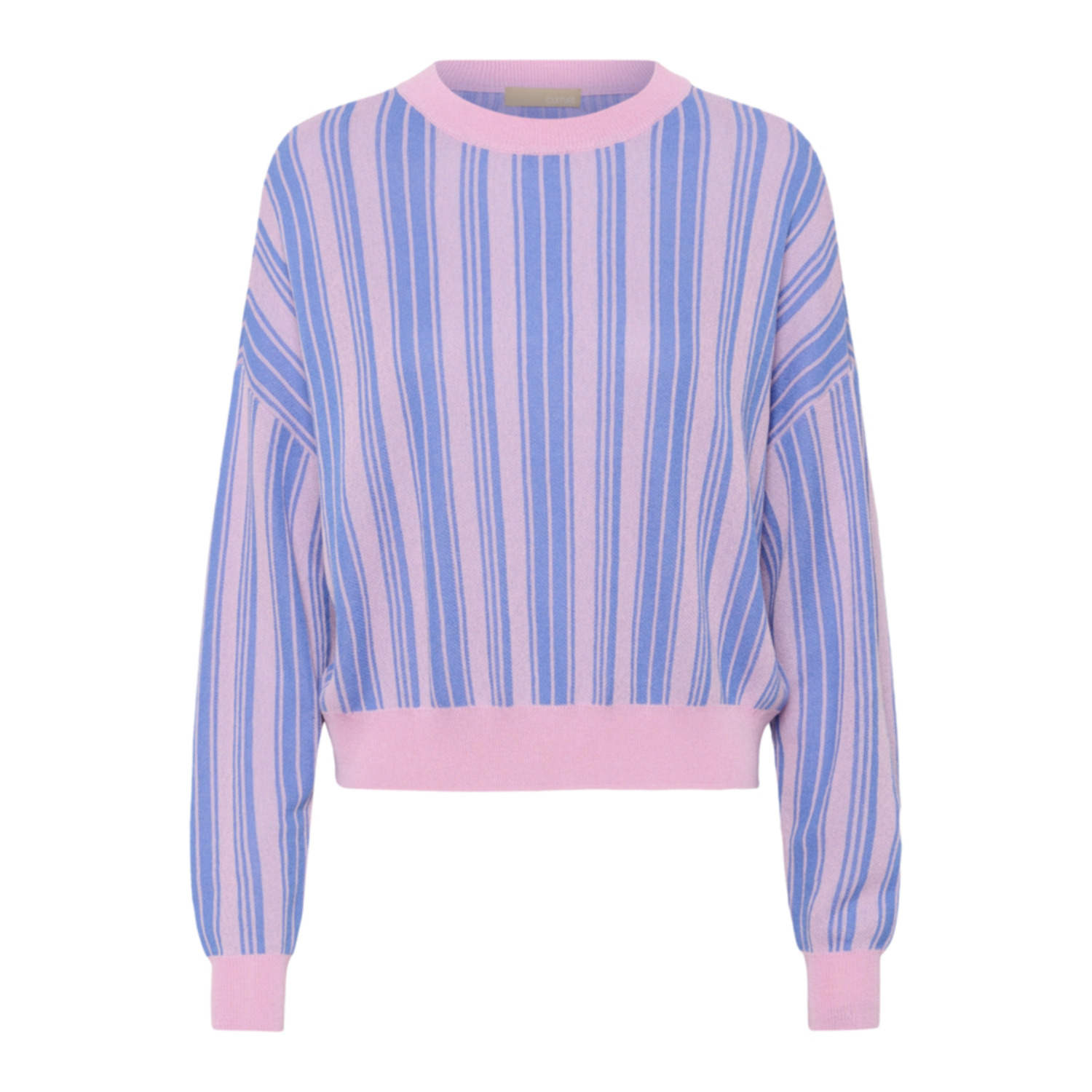 Materiaal: 89% Viscose, 11% Polyamide Lengte: kort Pasvorm: loose fit Wasvoorschrift: 30°C fijnwas Omschrijving: De Culture CUDeny Streep Trui in blauw-roze combineert een frisse streeplook met een zachte gebreide viscosekwaliteit. De comfortabele pasvorm en soepele knit maken deze trui ideaal voor dagelijks gebruik, terwijl de kleurcombinatie zorgt voor een speelse, stijlvolle uitstraling die makkelijk te combineren is. Kleur fabrikant: Begonia Pink/Nautical Blue Halslijn: rond Mouwlengte: lamge mouwen