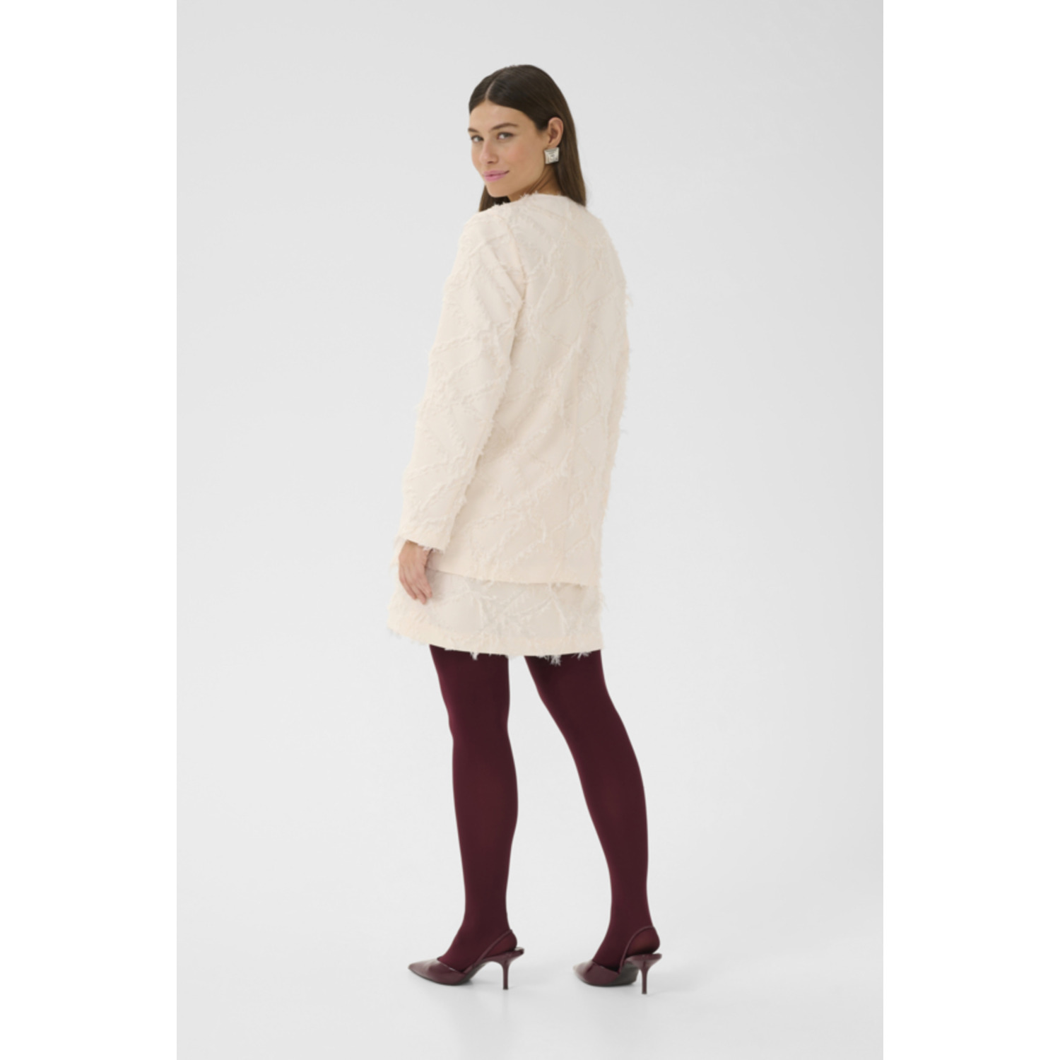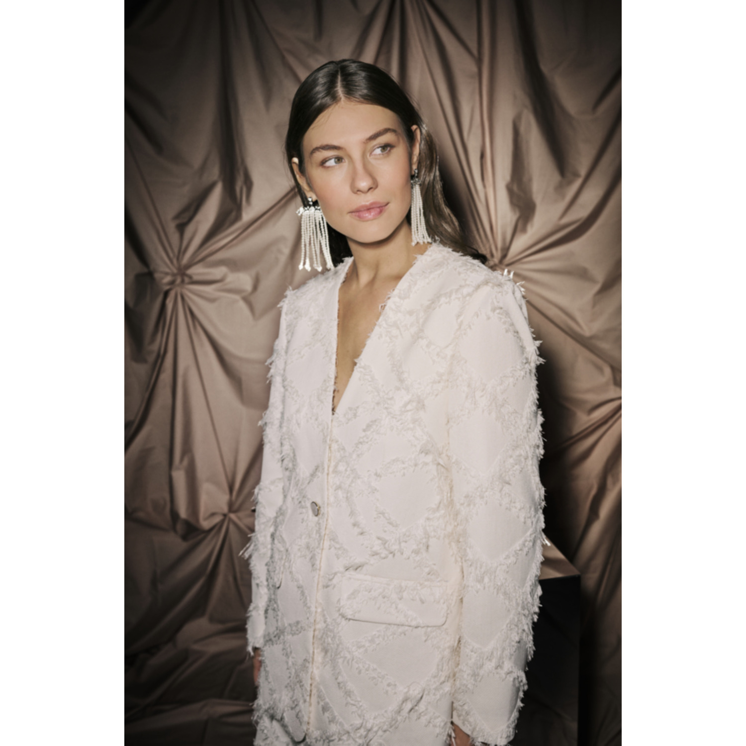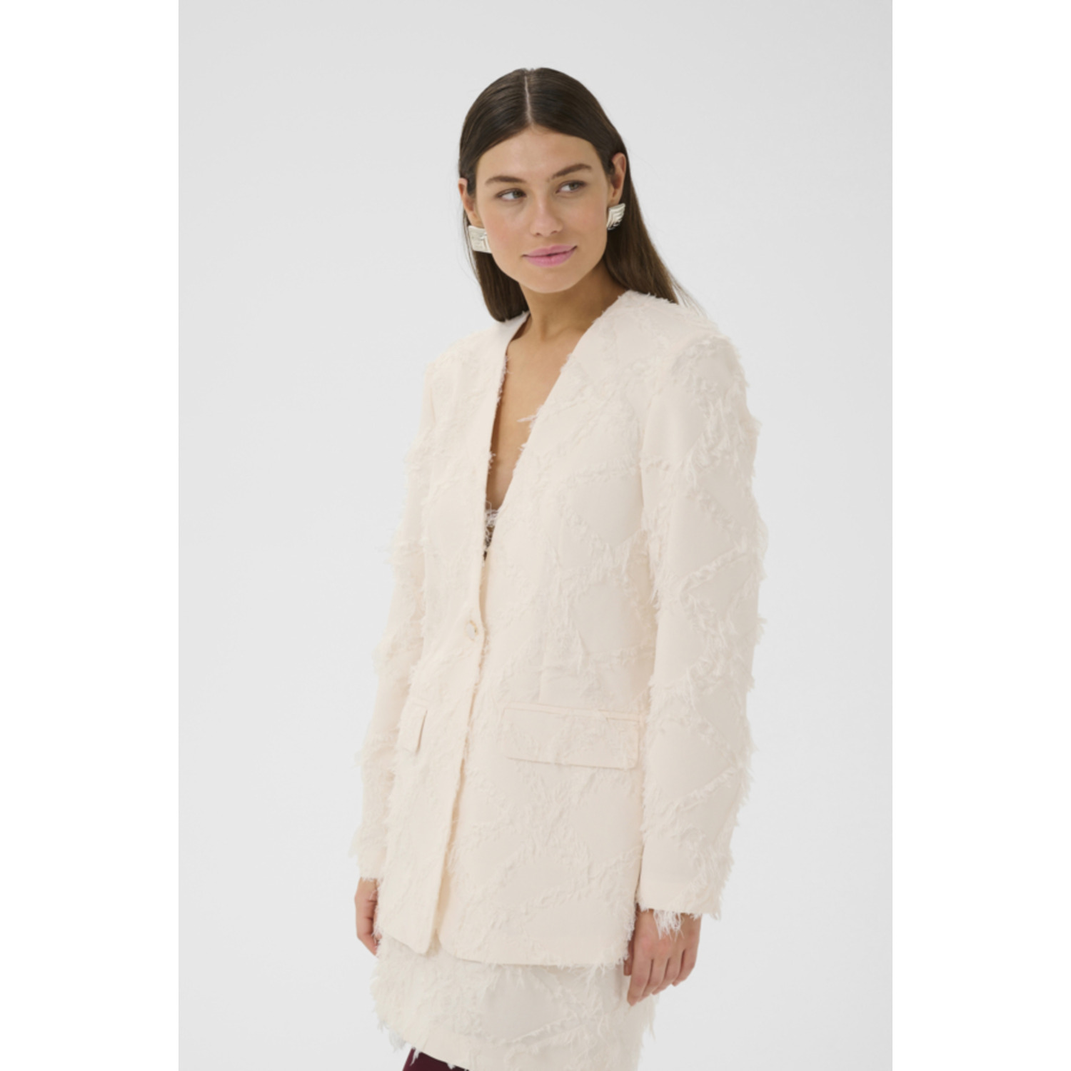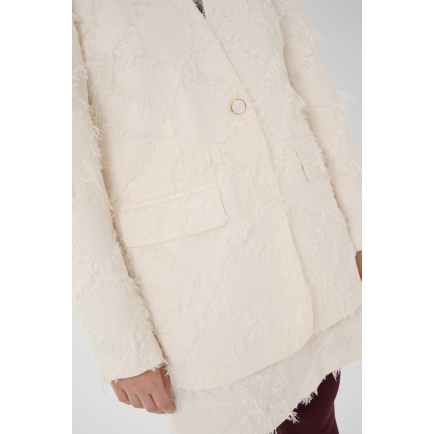 Omschrijving: De Culture CUHairy Blazer is een echte showstopper! Deze bijzondere blazer heeft een speels ‘veertjes’-effect in de stof, wat zorgt voor een luxueuze, feestelijke uitstraling. De witte tint geeft het jasje een stijlvolle look en de enkele goudkleurige knoopsluiting maakt het geheel elegant en vrouwelijk. Perfect voor feestelijke gelegenheden of om je outfit extra flair te geven.