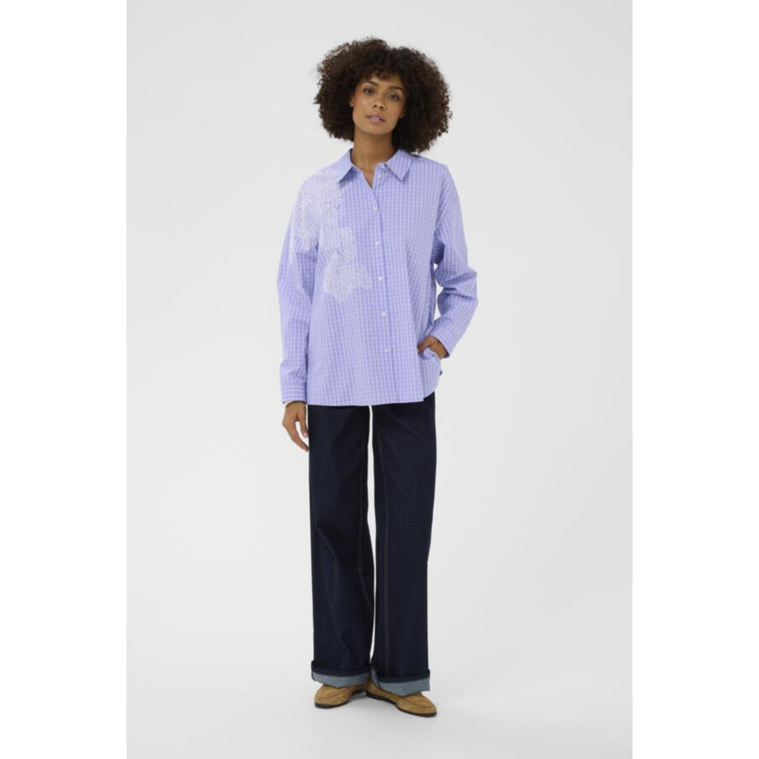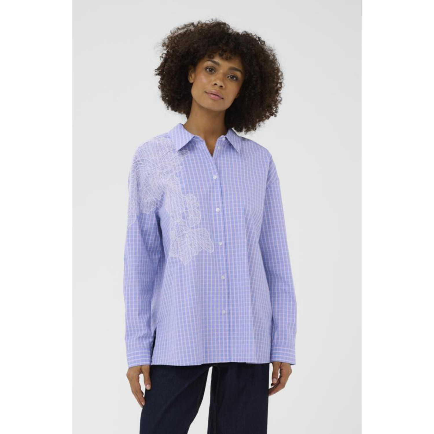 Materiaal: 60% Cotton, 40% Polyester Lengte: heup Pasvorm: oversized Wasvoorschrift: 30°C fijnwas Omschrijving: De Culture CUjane Deco blouse in blauw is een echte eyecatcher met verfijnde details. Het blauw-witte blokmotief geeft de blouse een grafische look, terwijl de wit geborduurde bloemenstrook over de rechterschouder zorgt voor een vrouwelijke, unieke touch. Mooi te combineren met jeans of een pantalon. Kleur fabrikant: blue check Halslijn: kraag Mouwlengte: lange mouwen Sluiting: knopen