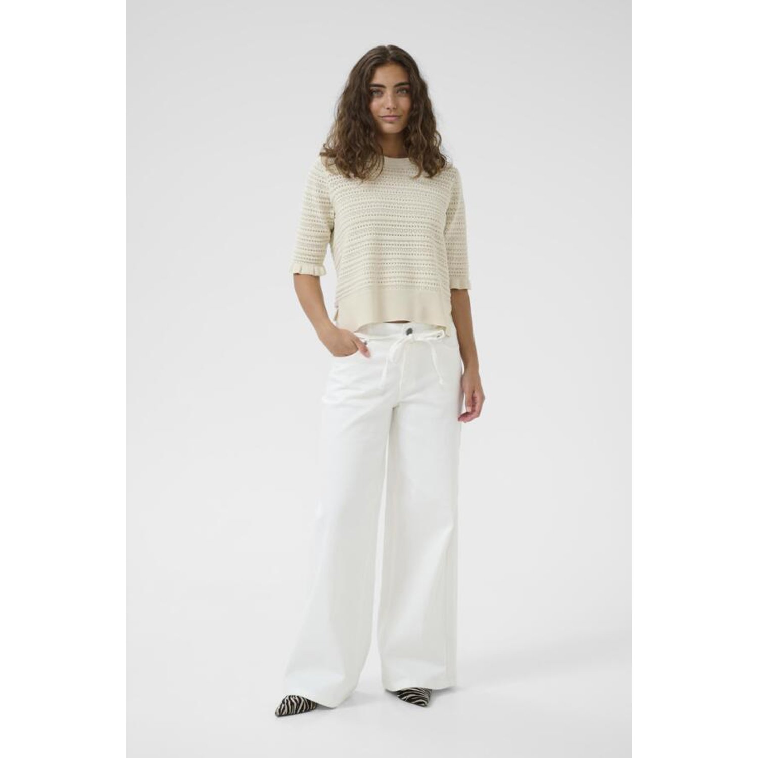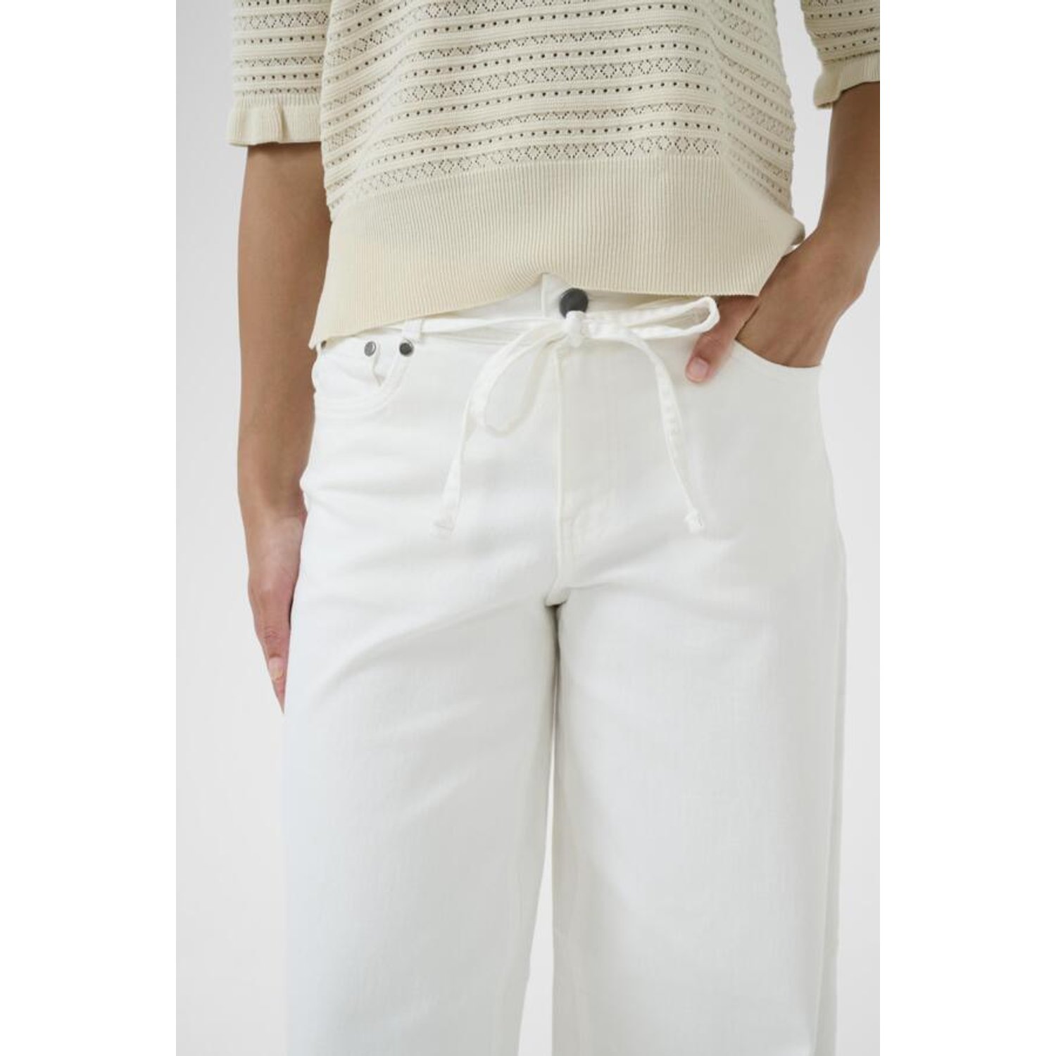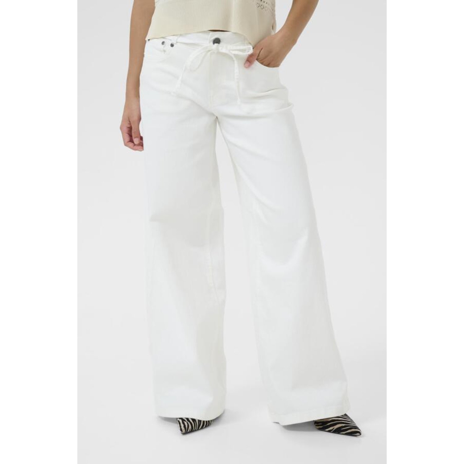 Omschrijving: De Culture CUTali Ami jeans in wit is een stijlvolle en comfortabele broek met een moderne wide leg pasvorm. De jeans heeft een strikdetail in de taille, wat zorgt voor een speels en vrouwelijk accent. De frisse witte kleur maakt deze broek perfect voor het voorjaar en de zomer.