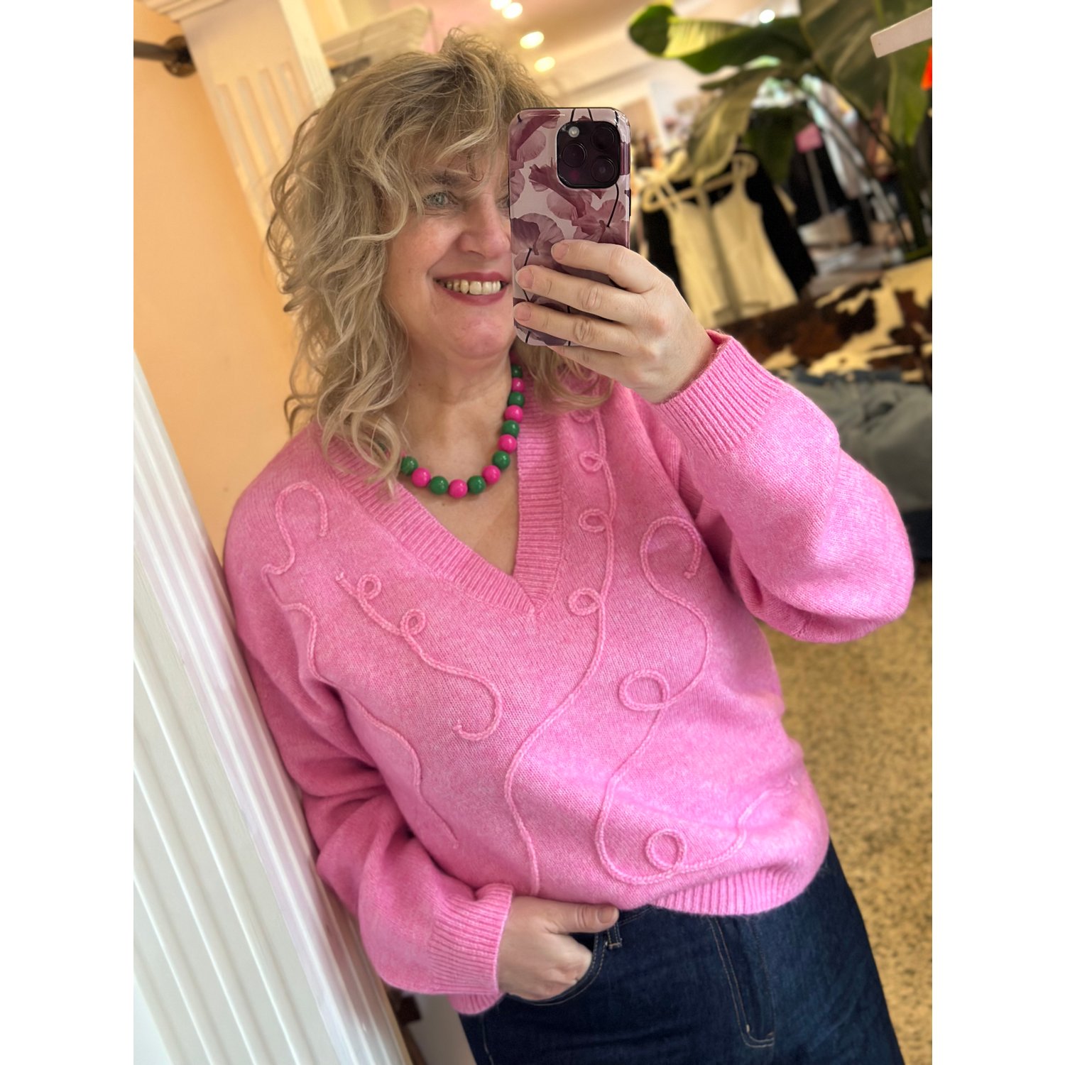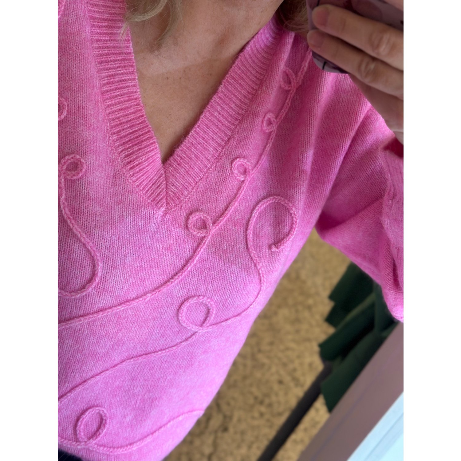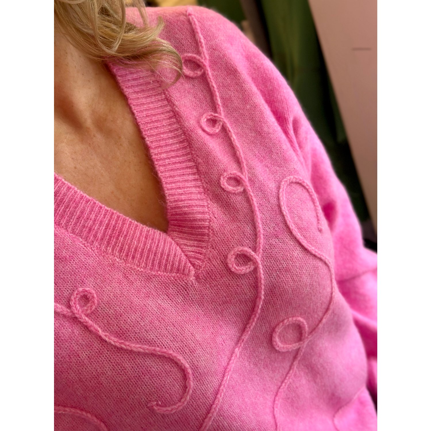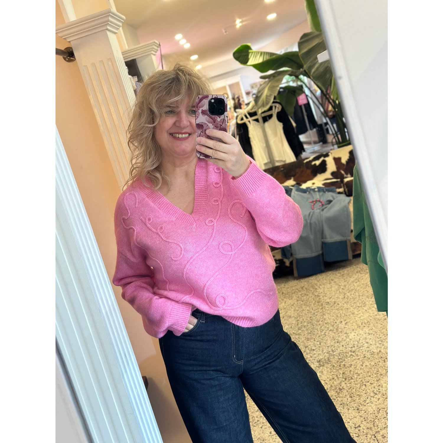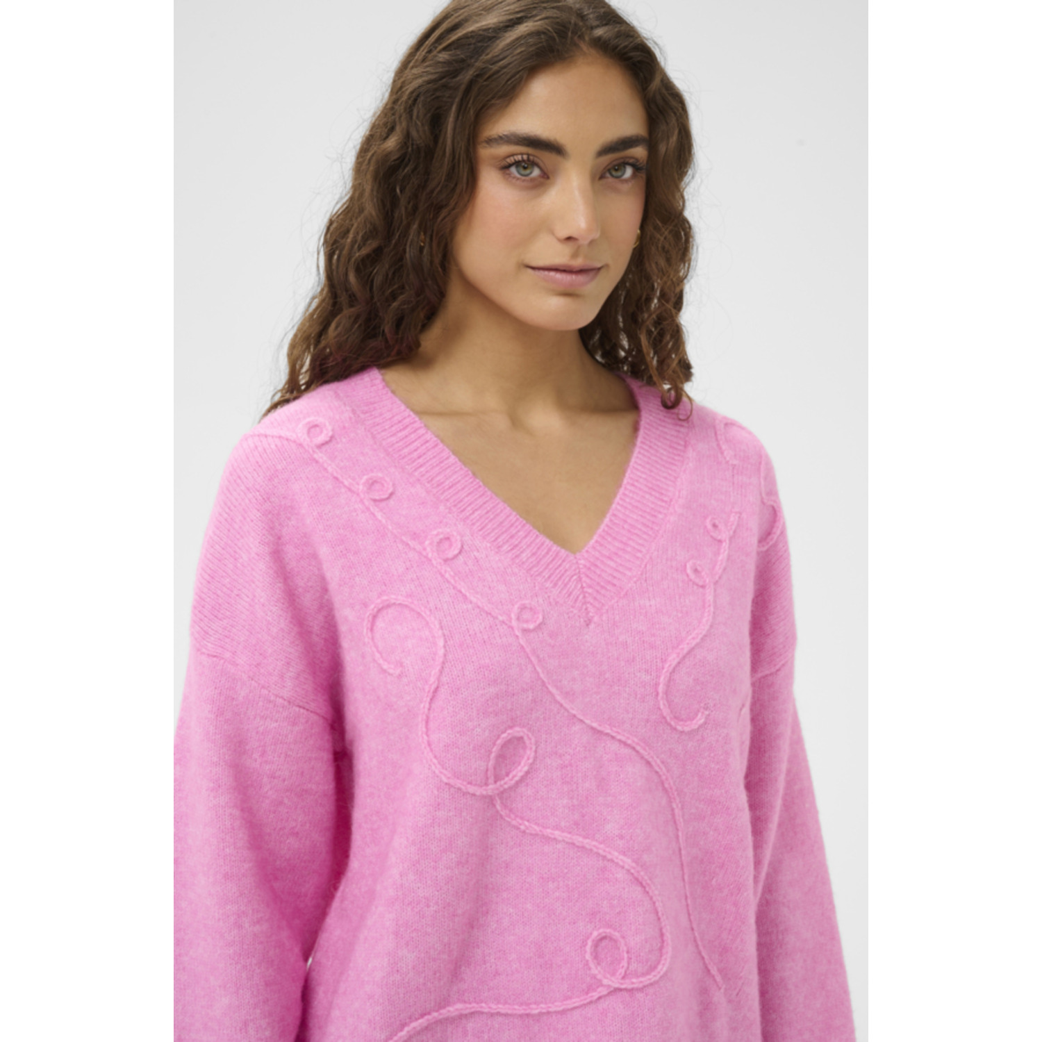 Omschrijving: De Culture CUtoby Kimmy trui in roze is een vrouwelijke en speelse knit met verfijnde details. De V-hals is afgewerkt met een subtiel krullintdetail dat doorloopt langs de hals en voorzijde. Gemaakt van een zachte kwaliteit en perfect voor een comfortabele maar stijlvolle everyday look.