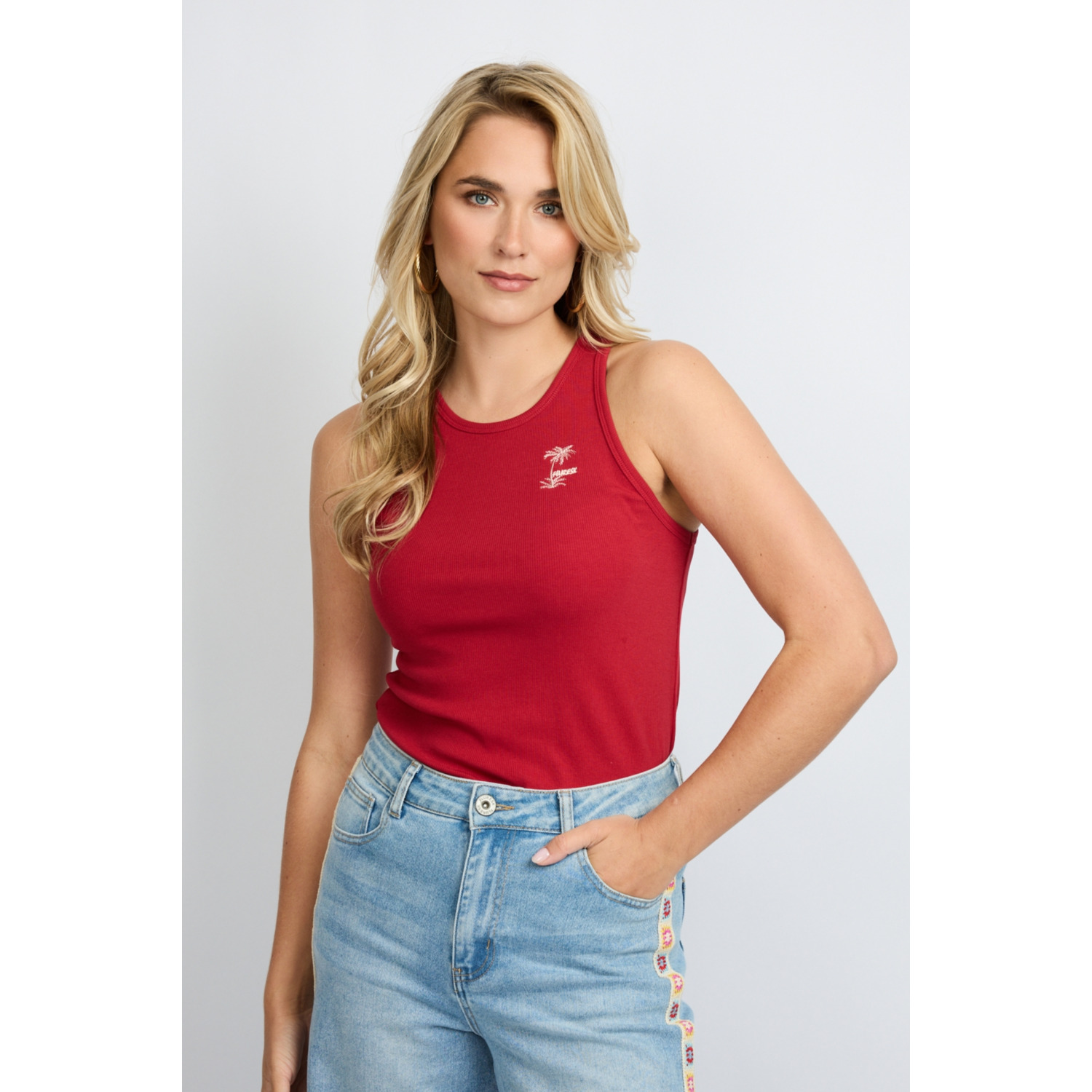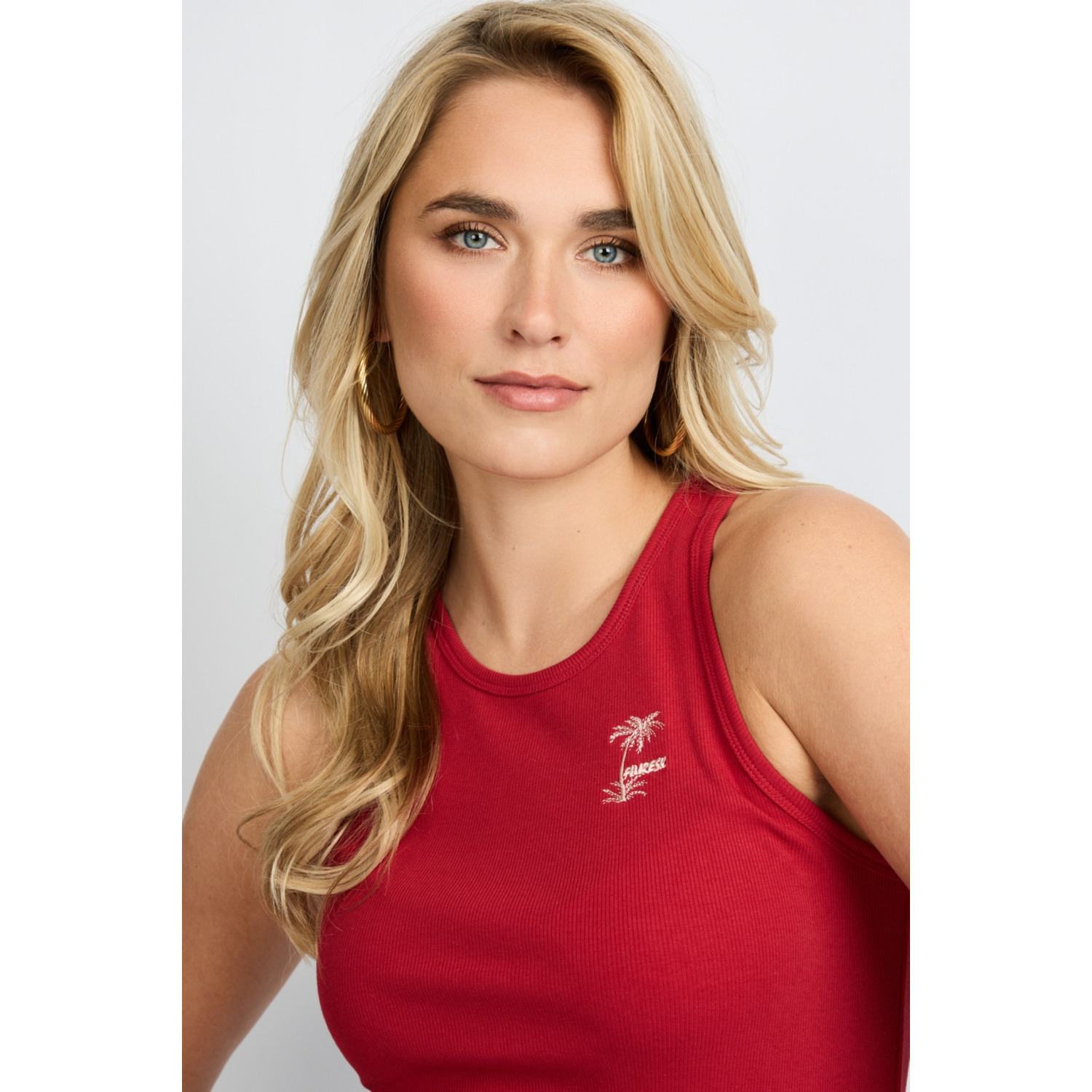 Omschrijving: De Fluresk Awena Tanktop in ruby red is een sportieve en vrouwelijke basic met een zomerse uitstraling. De aangesloten fit en zachte ribstof zorgen voor een comfortabele pasvorm. De racerback geeft de top een sportieve touch, terwijl het subtiele palmboom borduursel op de borst een speels detail toevoegt.