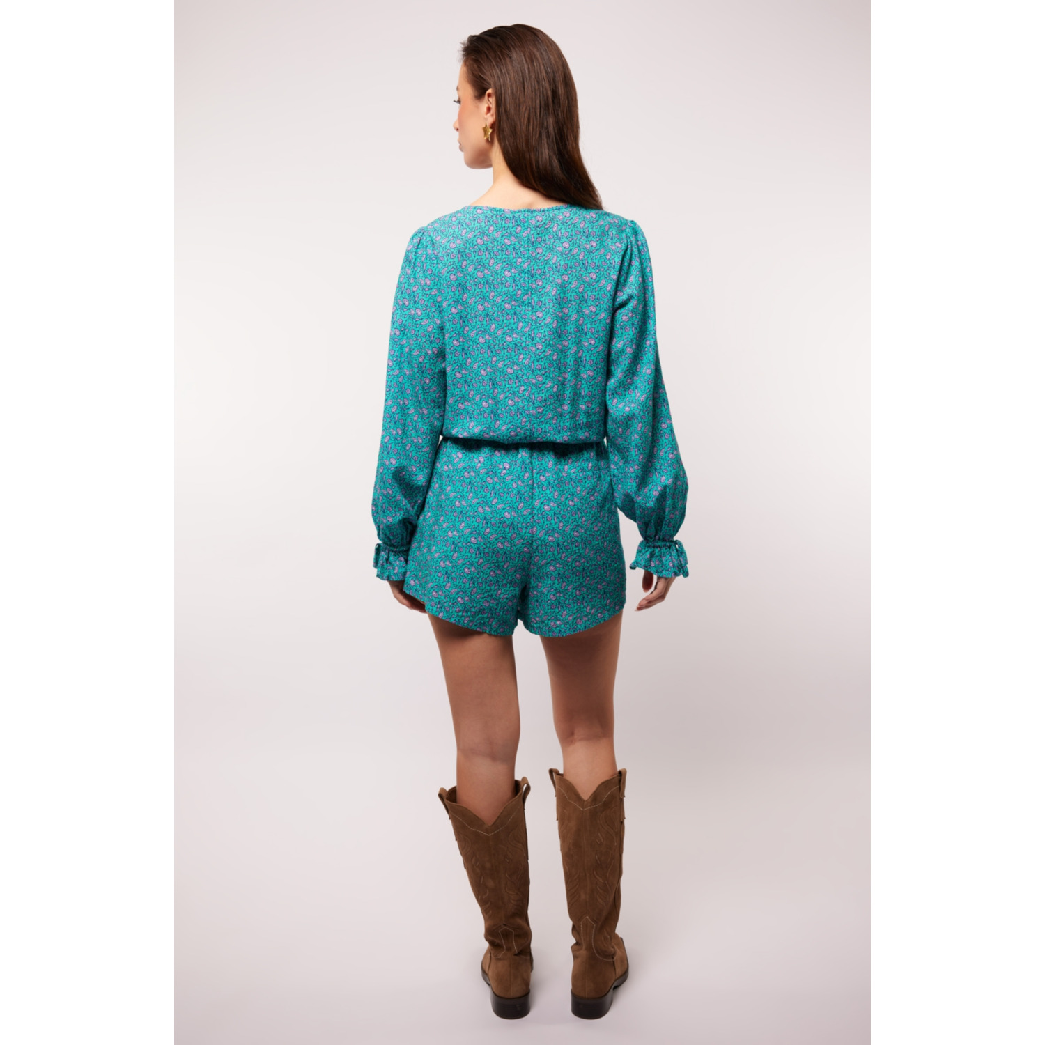 Bijzonderheden: Houd het stijlvol en speels met de CADEN PLAYSUIT. Deze prachtige playsuit in een levendige turquoise tint combineert een flatterende pasvorm met een luchtige, comfortabele stof. Het subtiele patroon, de lange mouwen en de elastische taille met strikdetail maken dit item perfect voor zowel casual als chique gelegenheden. Draag de CADEN PLAYSUIT met sandalen voor een zomerse look of voeg hakken en accessoires toe voor een avondje uit. Het V-hals ontwerp en de lichte stof zorgen ervoor dat je je de hele dag comfortabel én zelfverzekerd voelt.