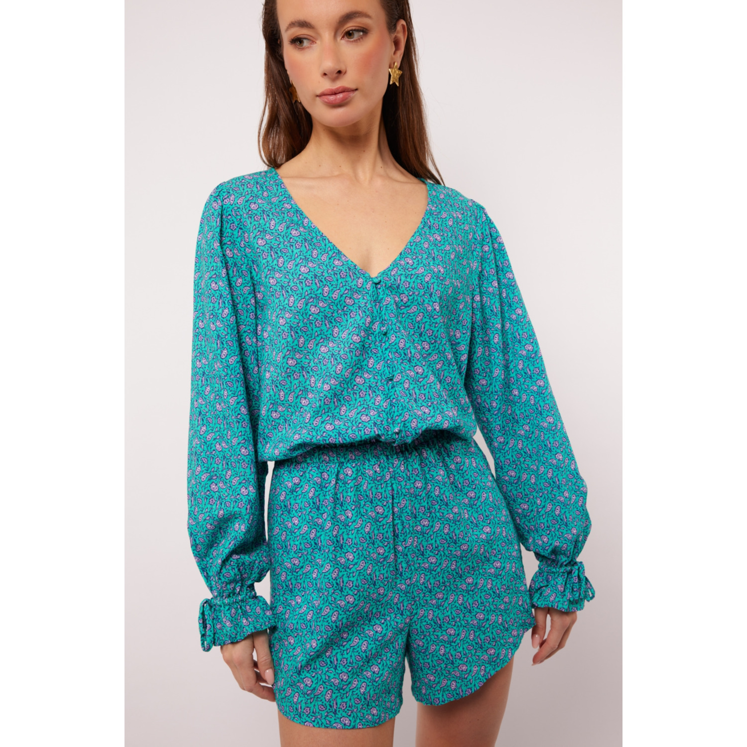 Materiaal: 70% Katoen, 30% Viscose Lengte: korte lengte Pasvorm: regular fit Wasvoorschrift: 30°C fijnwas, uitstrijken ivm lichte krimp Bijzonderheden: Houd het stijlvol en speels met de CADEN PLAYSUIT. Deze prachtige playsuit in een levendige turquoise tint combineert een flatterende pasvorm met een luchtige, comfortabele stof. Het subtiele patroon, de lange mouwen en de elastische taille met strikdetail maken dit item perfect voor zowel casual als chique gelegenheden. Draag de CADEN PLAYSUIT met sandalen voor een zomerse look of voeg hakken en accessoires toe voor een avondje uit. Het V-hals ontwerp en de lichte stof zorgen ervoor dat je je de hele dag comfortabel én zelfverzekerd voelt. Kleur fabrikant: tropical aqua verbena Halslijn: v-hals Mouwlengte: lange mouwen Sluiting: knoopjes Heuphoogte: highwaist Broekzakken: steekzakken