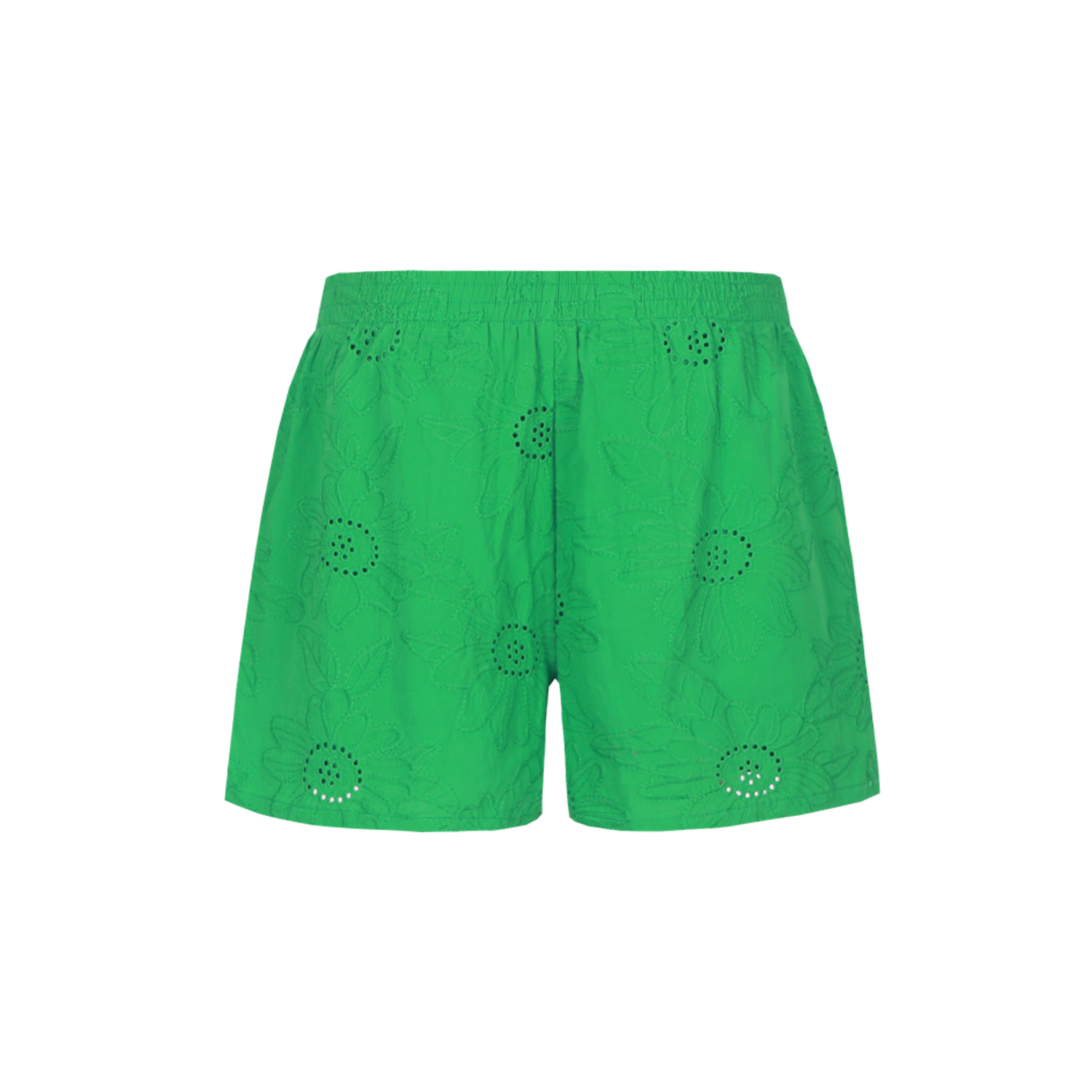 Materiaal: 100% katoen Lengte: kort Pasvorm: regular Wasvoorschrift: 30°C fijnwas Omschrijving: De Fluresk Marly Shorts in groen heeft een comfortabele fit en is gemaakt van een luchtige broderie stof met subtiele bloemen details. De elastische tailleband zorgt voor extra draagcomfort en een fijne pasvorm. Perfect voor warme dagen en leuk te combineren met het bijpassende Mae T-shirt voor een complete set. Kleur fabrikant: vivid green Sluiting: elastische boord Heuphoogte: mid waist Broekzakken: steekzakken