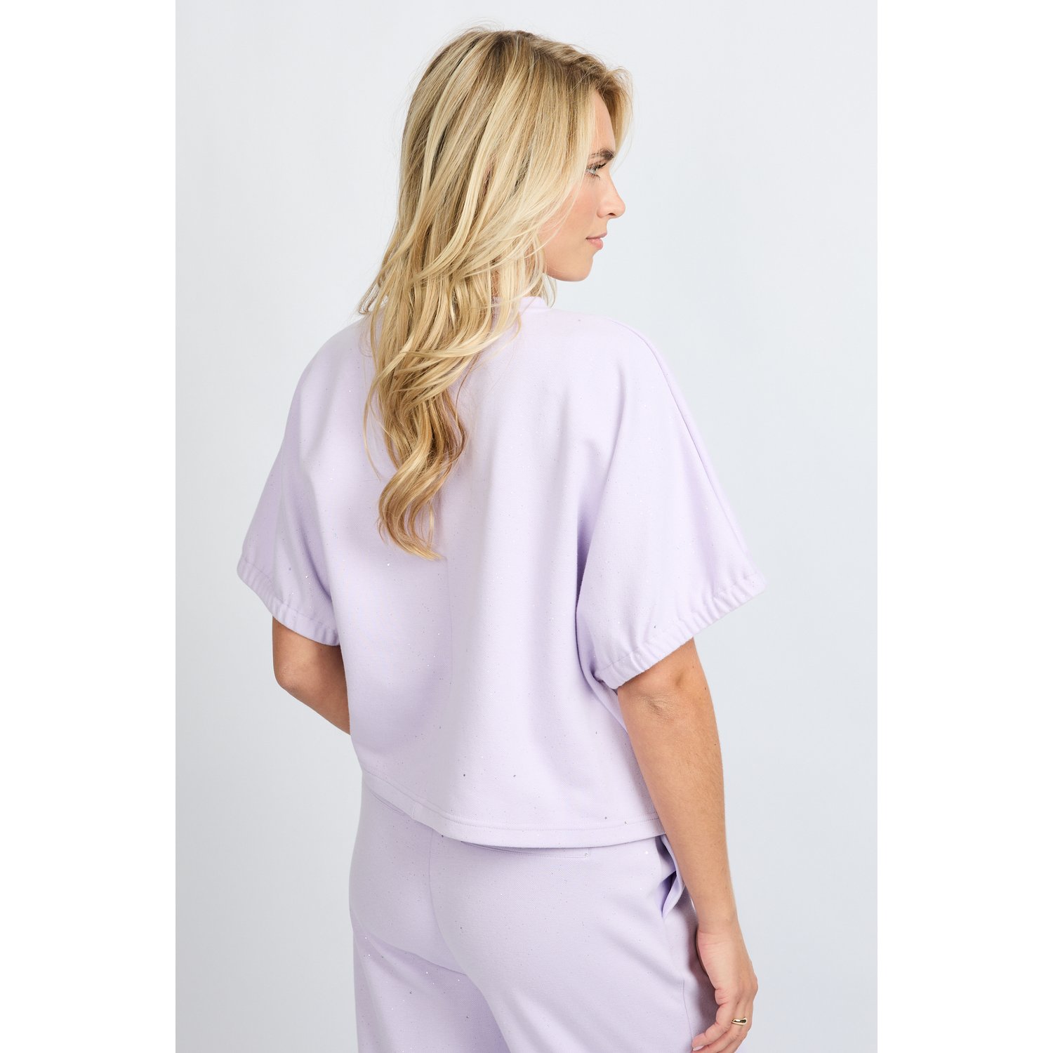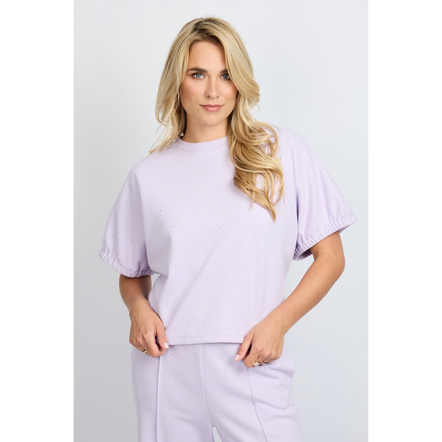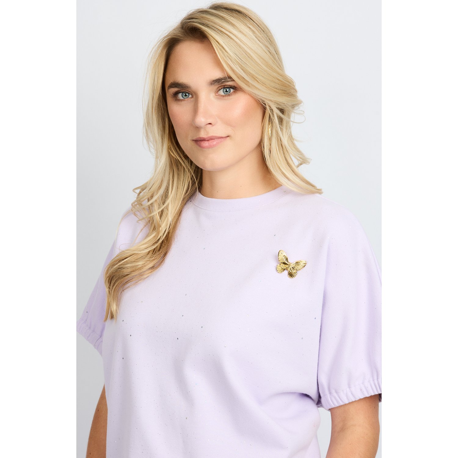 Omschrijving: De Fluresk Mavelis Top in licht paars is een stijlvolle aanvulling op de bijpassende Ewan pants. De boxy fit en korte mouwen geven een moderne, nonchalante uitstraling. De subtiele glitter in de stof zorgt voor een zachte glow, terwijl de gouden vlinder broche op de borst een elegant detail toevoegt.