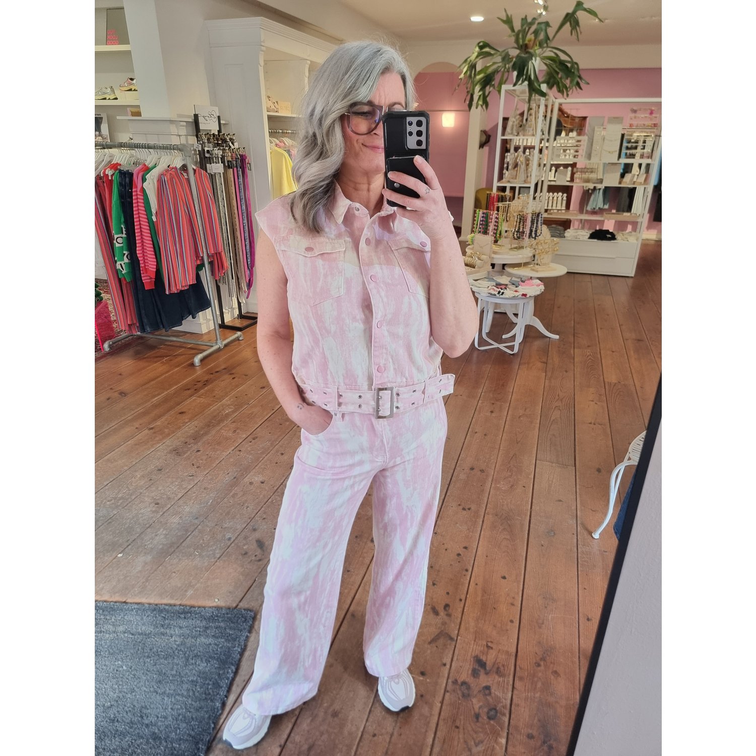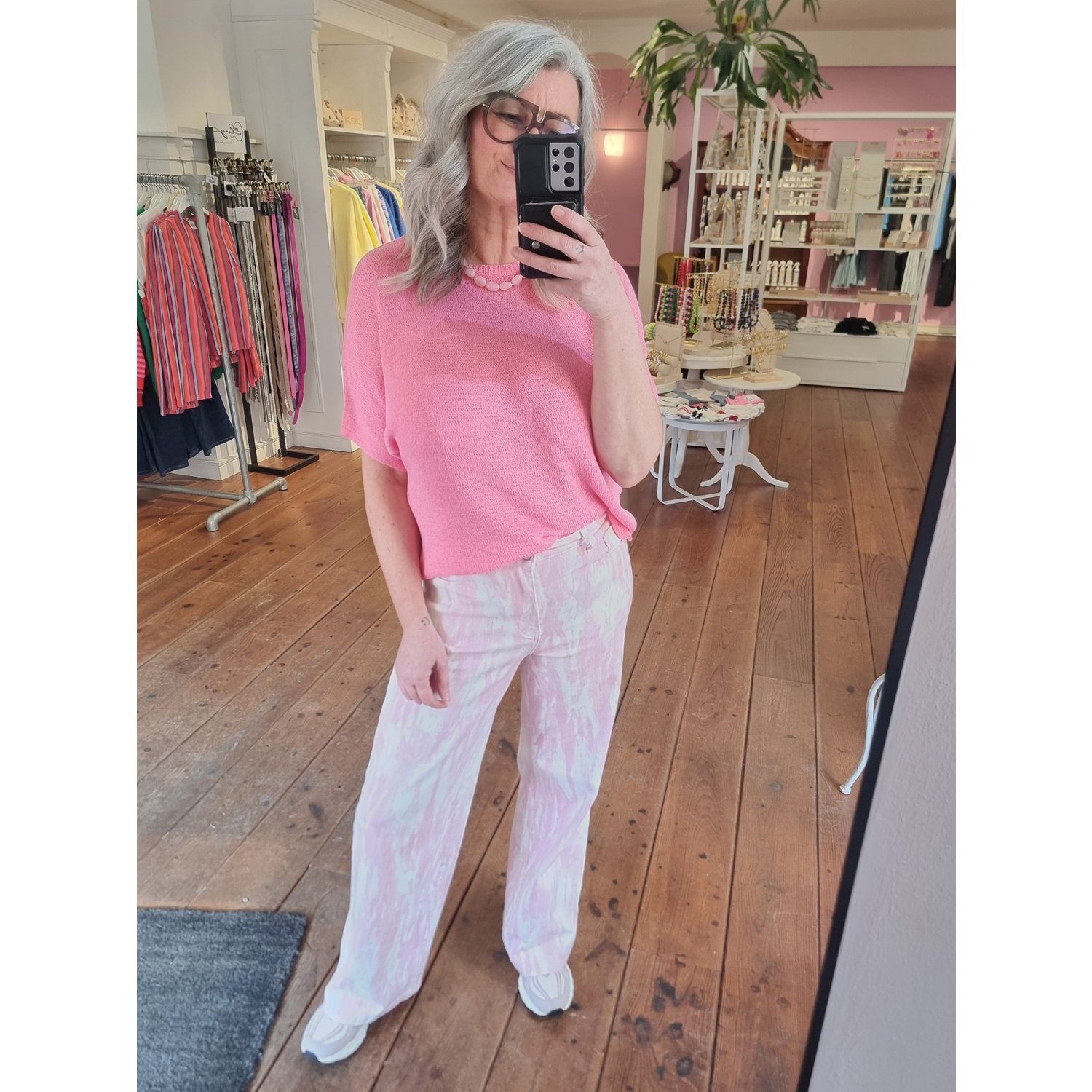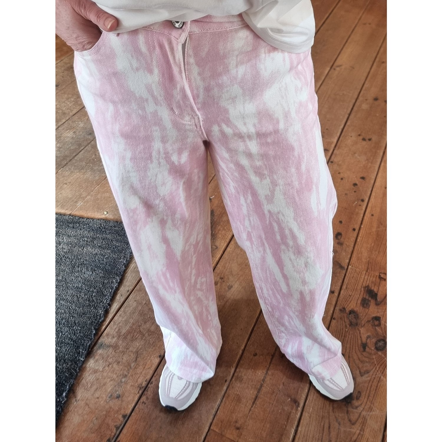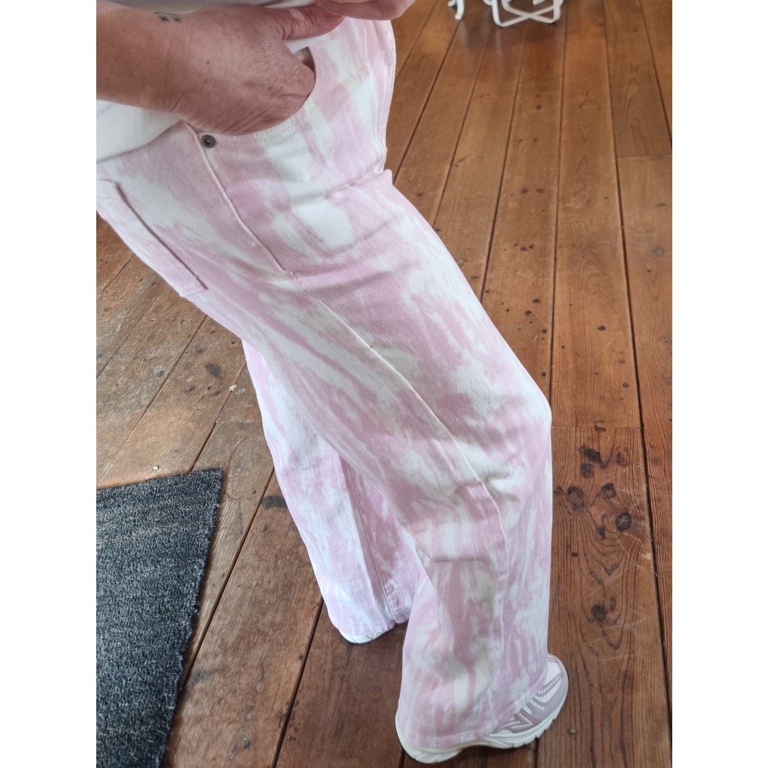 Omschrijving: De Fluresk Nysa Jeans is een opvallende wide leg jeans van zacht katoen met elasthan voor een comfortabele pasvorm. De wit met roze tie dye print geeft de broek een speelse en trendy uitstraling. Dankzij de hoge taille en wijde pijpen creëer je een stijlvol silhouet. Perfect te combineren met het bijpassende Tami gilet.