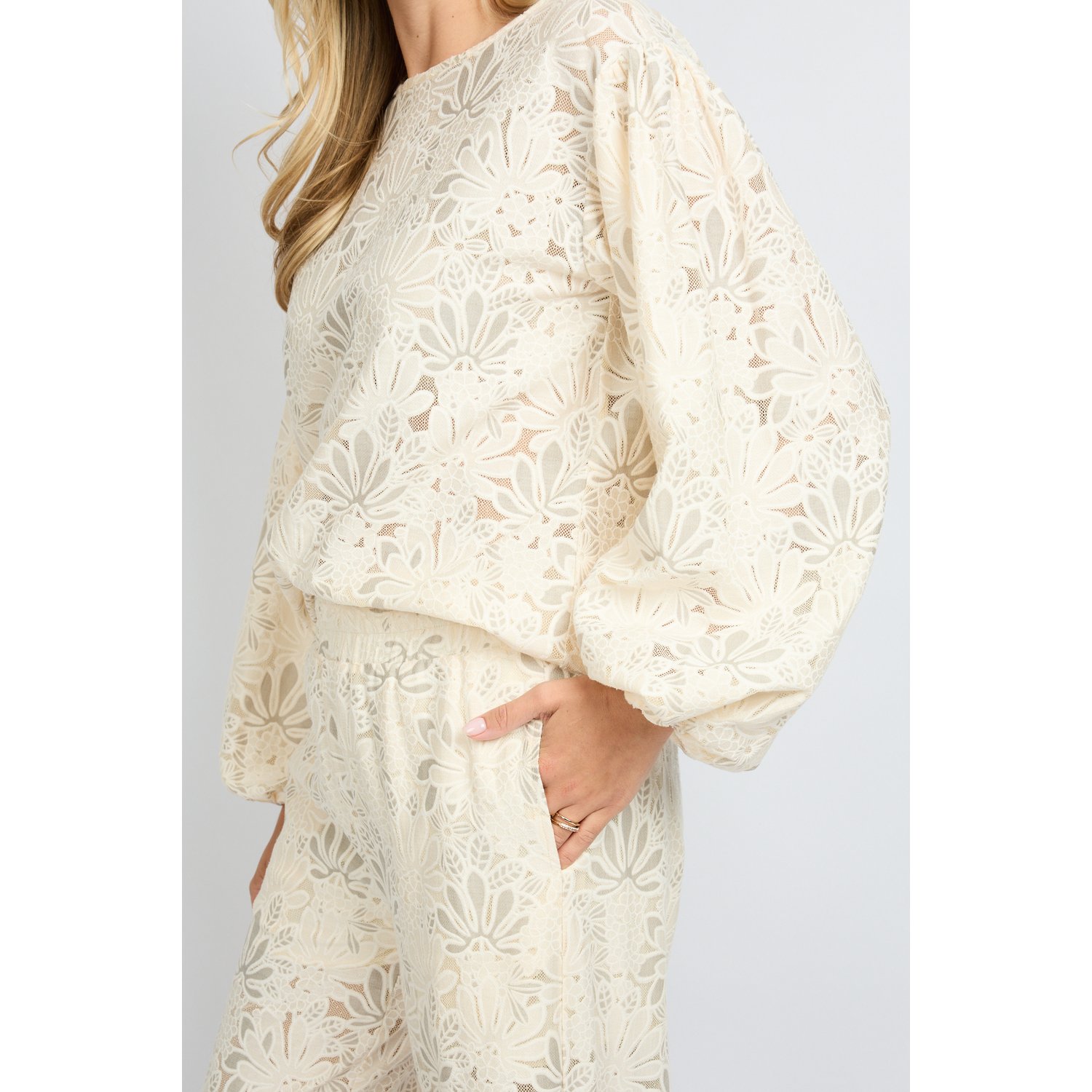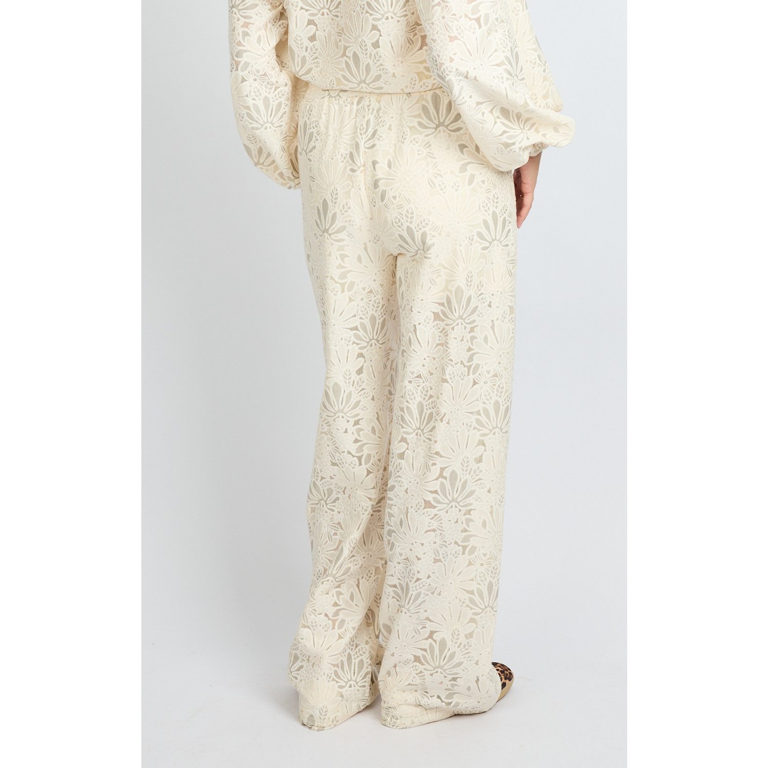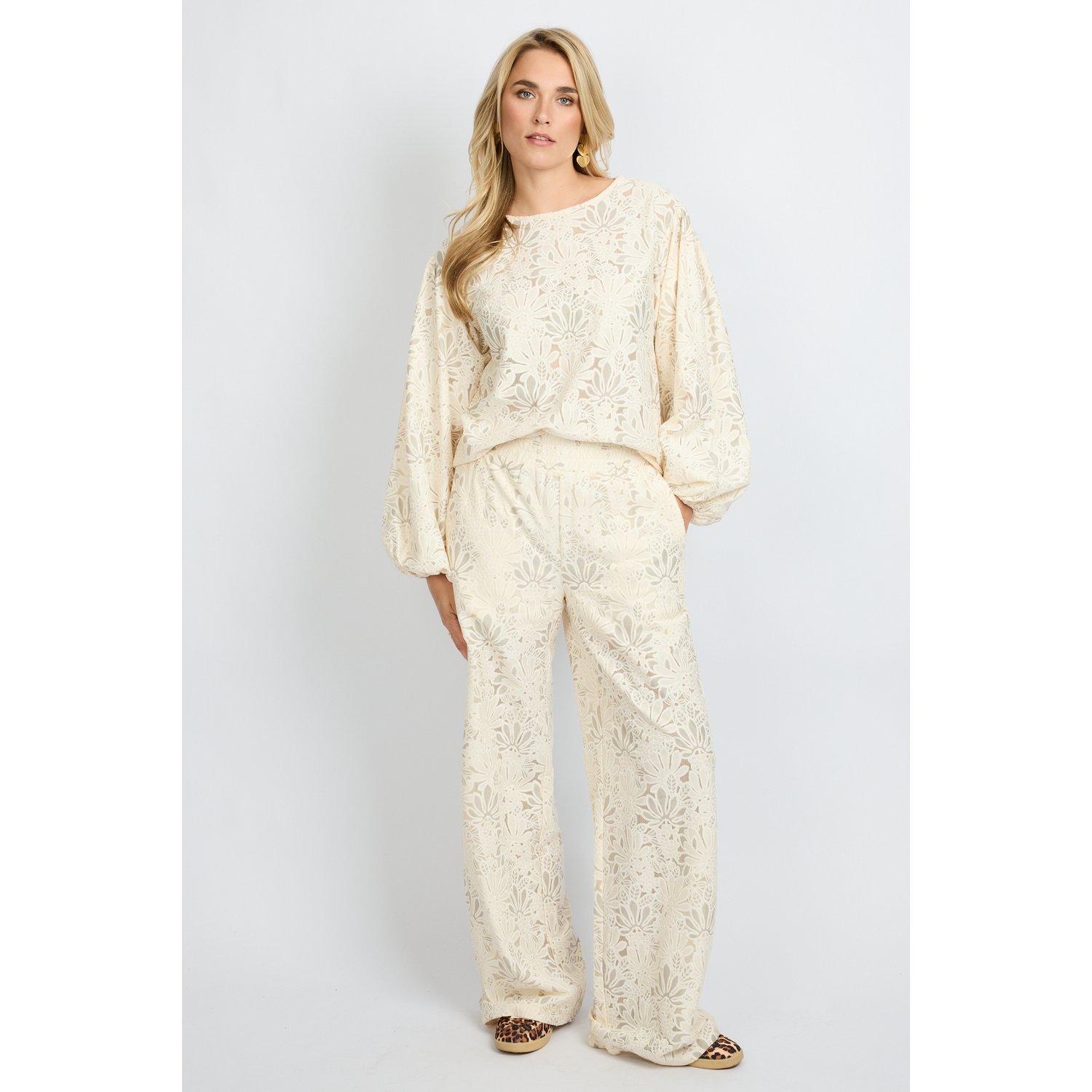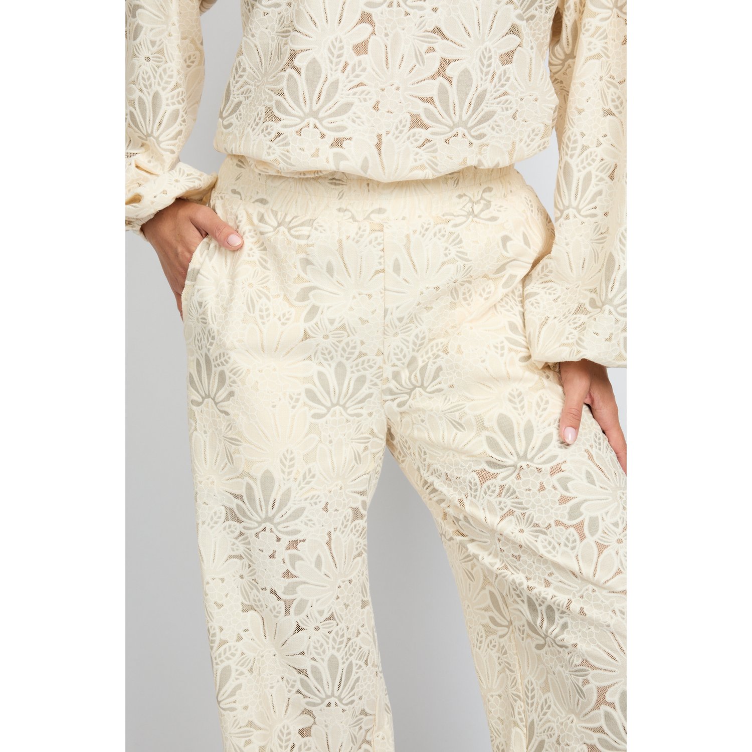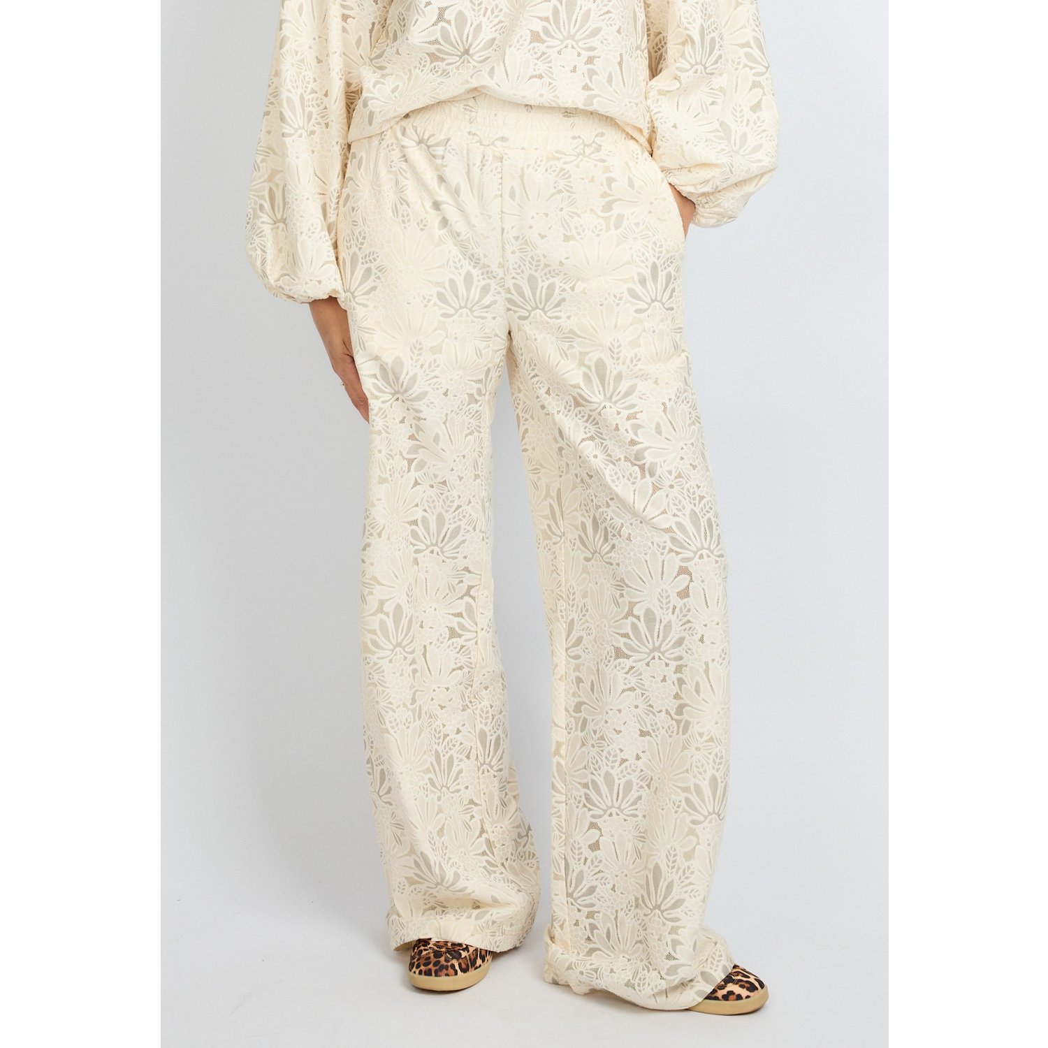 Omschrijving: De Fluresk Paloma Pants in roomwit is een elegante broek met all-over bloemkant. De wide fit en elastische tailleband zorgen voor een comfortabele en luchtige pasvorm. Dankzij het korte broekje als voering draag je ‘m zorgeloos. Een stijlvolle eyecatcher, perfect te combineren met de bijpassende blouse top.