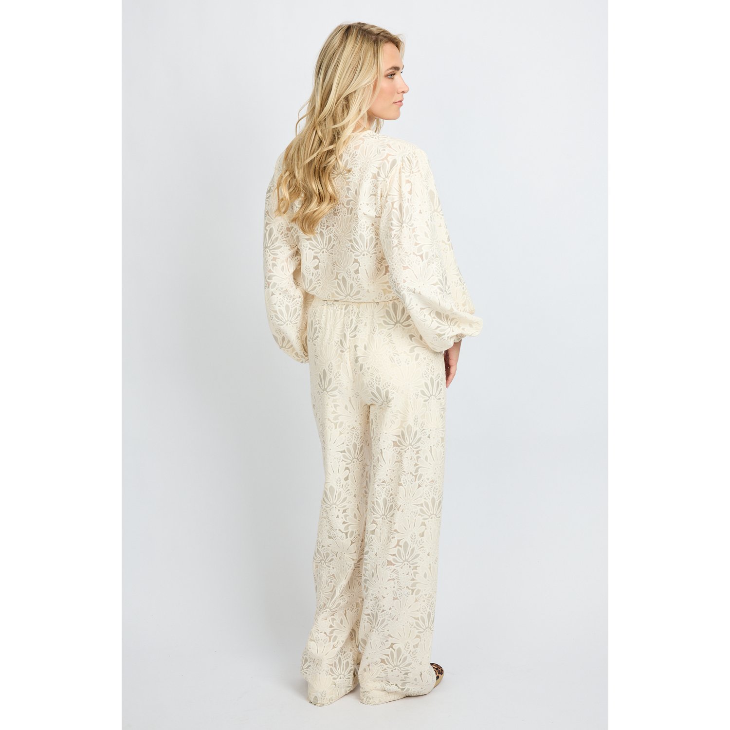 Materiaal: 70% katoen 30% polyester Lengte: lange lengte Pasvorm: wide leg Wasvoorschrift: 30°C fijnwas Omschrijving: De Fluresk Paloma Pants in roomwit is een elegante broek met all-over bloemkant. De wide fit en elastische tailleband zorgen voor een comfortabele en luchtige pasvorm. Dankzij het korte broekje als voering draag je ‘m zorgeloos. Een stijlvolle eyecatcher, perfect te combineren met de bijpassende blouse top. Kleur fabrikant: offwhite Sluiting: elastische boord Heuphoogte: high waisted Broekzakken: steekzakken