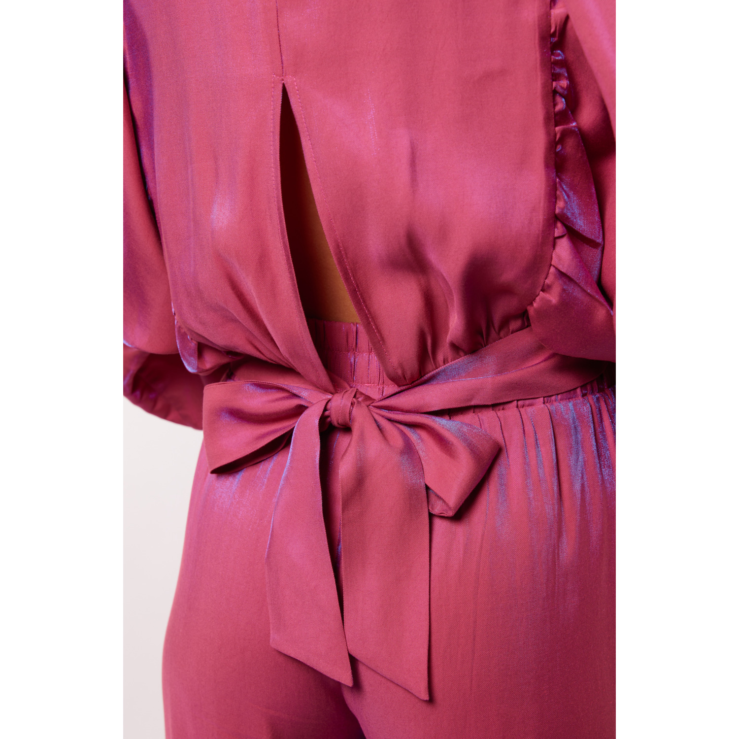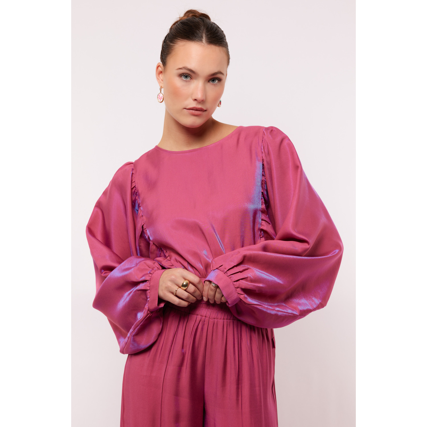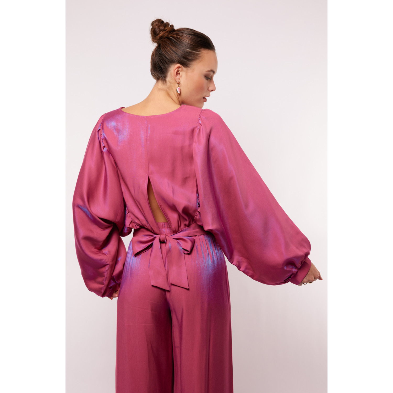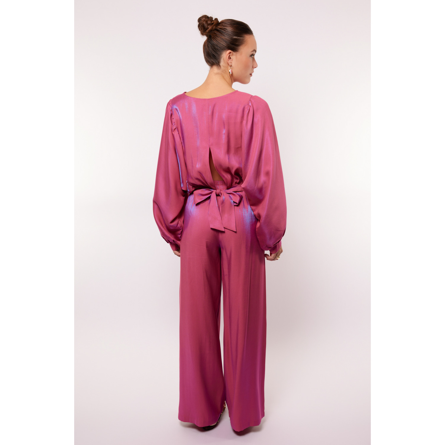 Omschrijving: Shop de Fluresk Tes blouse top in roze met boothals, wijde mouwen en strikdetail op de rug. Een elegante cropped top, perfect te combineren met de Loretta pants.