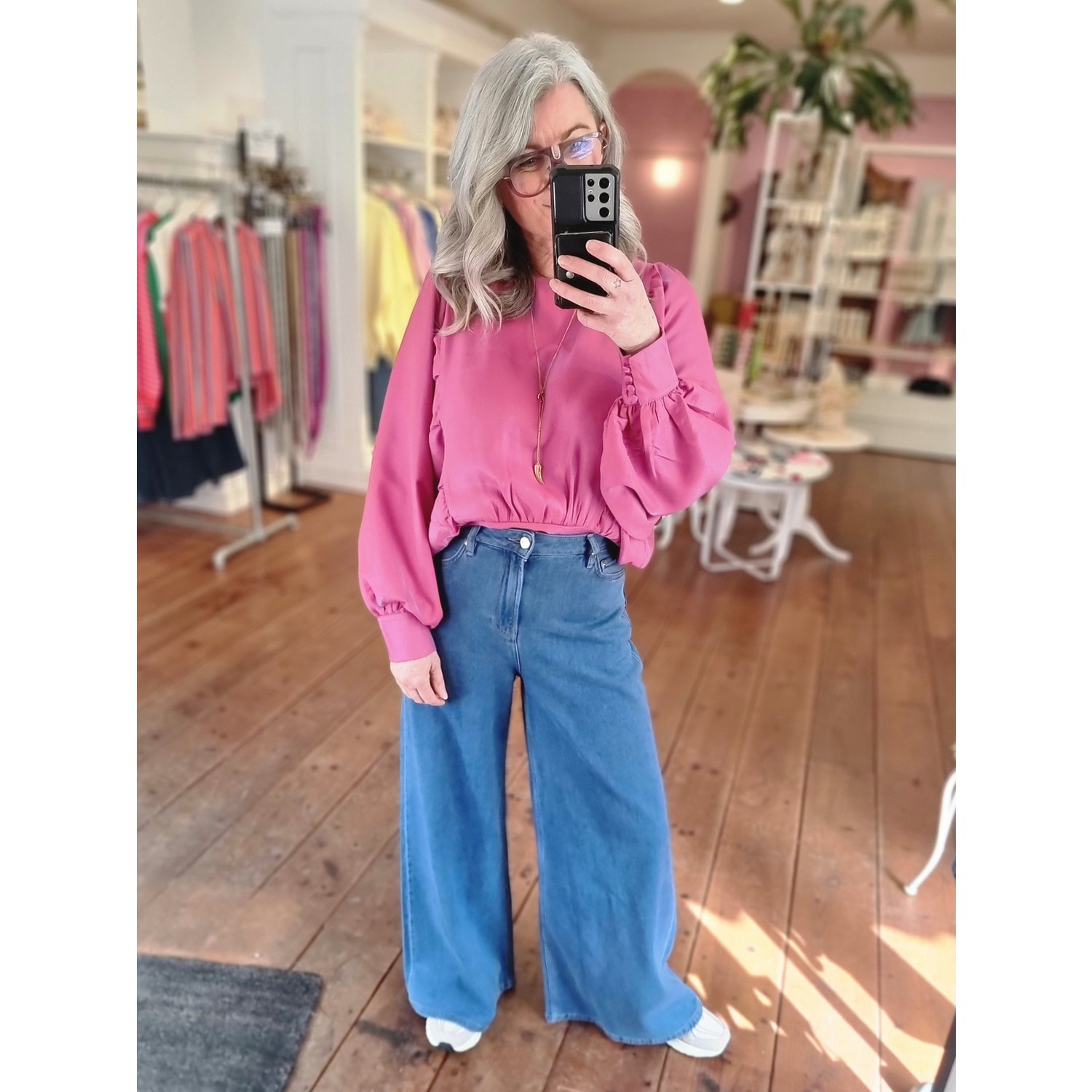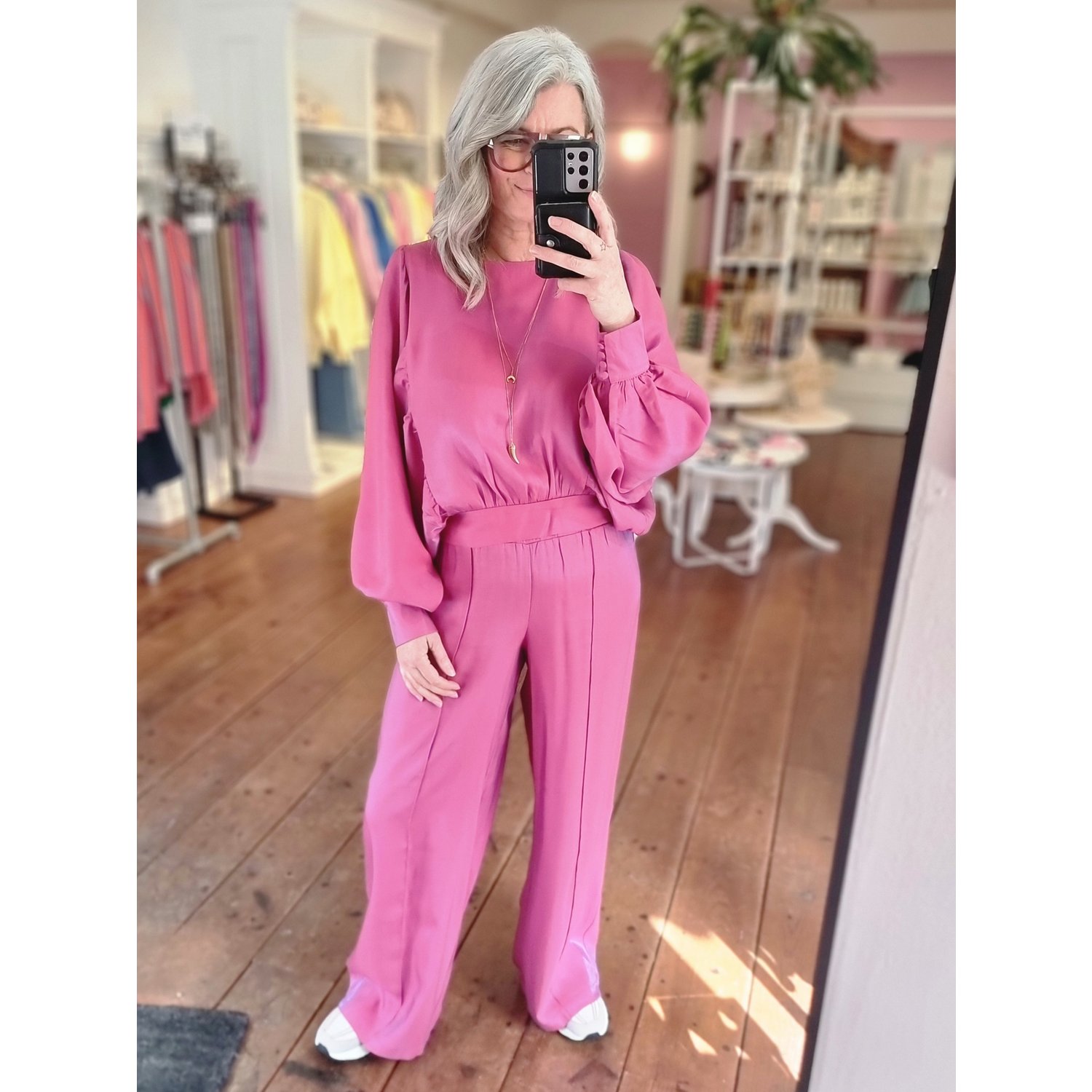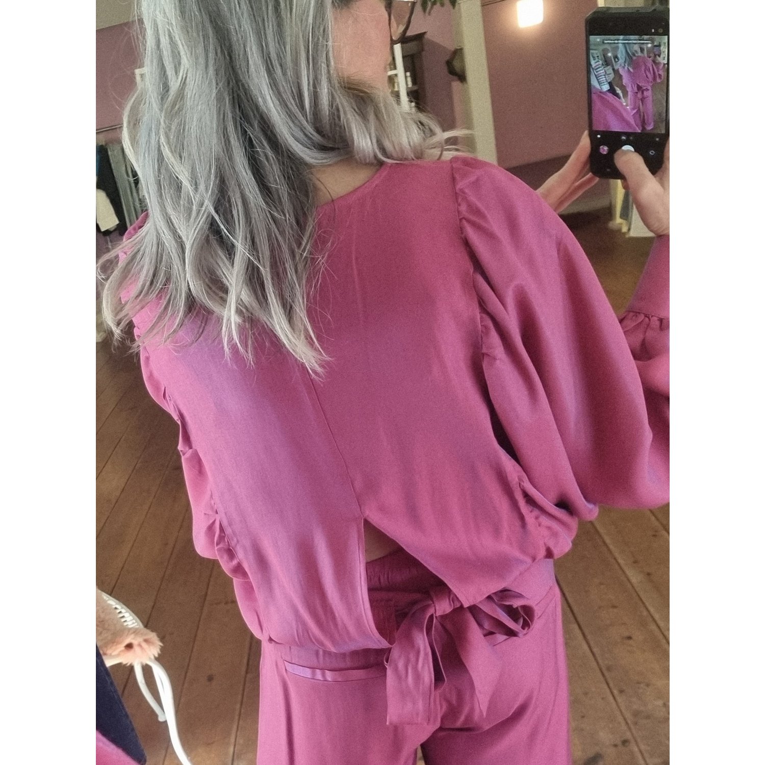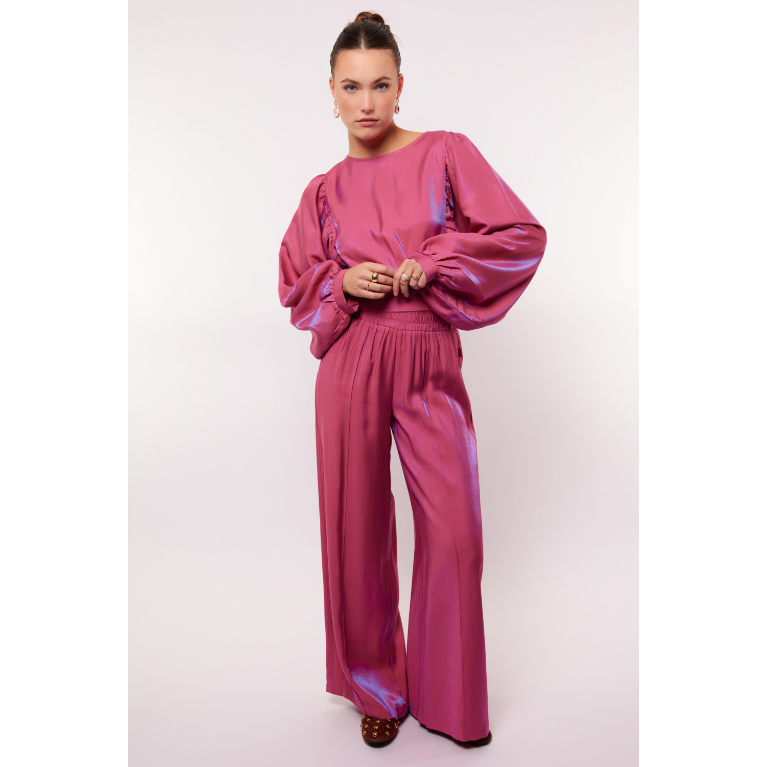 Omschrijving: Shop de Fluresk Tes blouse top in roze met boothals, wijde mouwen en strikdetail op de rug. Een elegante cropped top, perfect te combineren met de Loretta pants.