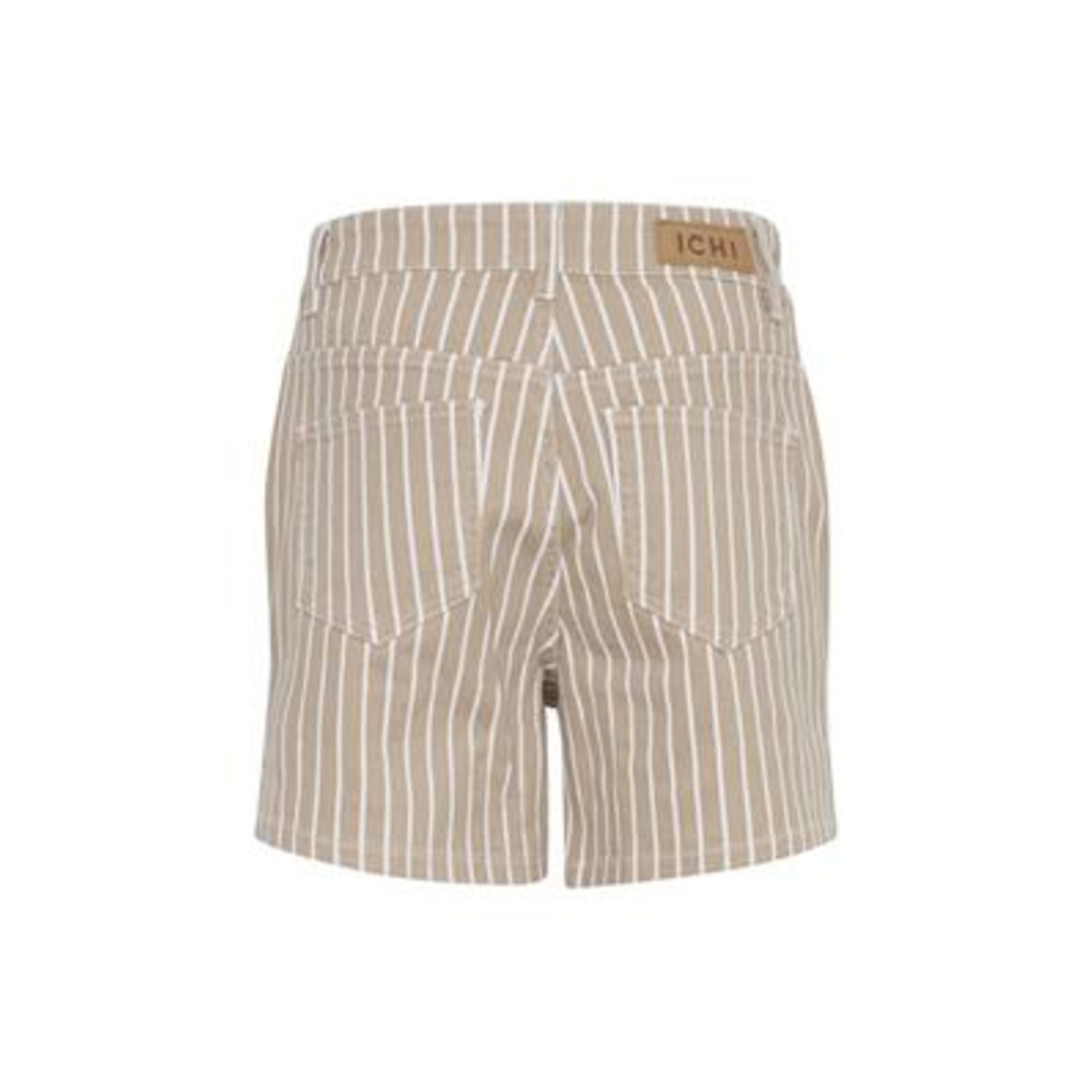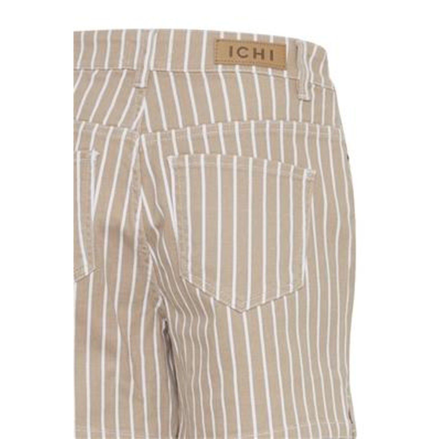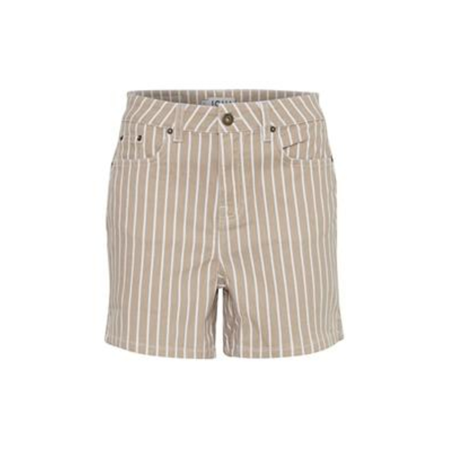 Materiaal: 98% Cotton,2% Elastane Lengte: Korte Lengte Pasvorm: Loose Fit Wasvoorschrift: 30°C Fijnwas Bijzonderheden: Denim shortje in beige streep design Kleur fabrikant: Nomad Sluiting: Knoop Rist sluiting Heuphoogte: Mid Waist Broekzakken: 5 pocket