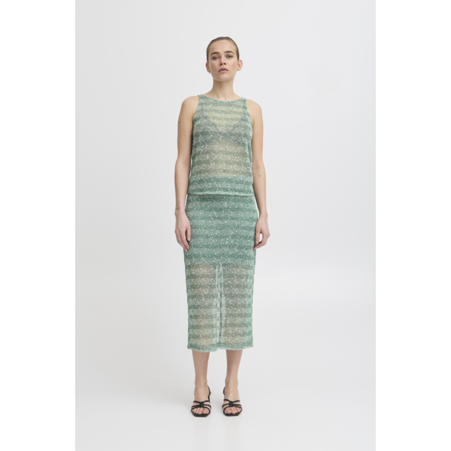 Materiaal: 100% polyester Lengte: normale lengte Pasvorm: loose fit Wasvoorschrift: 30°C fijnwas Bijzonderheden: combineer deze transparante top van ichi met een stoere jeans of de bijpassende rok voor een feestlijke party look Kleur fabrikant: pine green Halslijn: ronde hals Mouwlengte: mouwloos