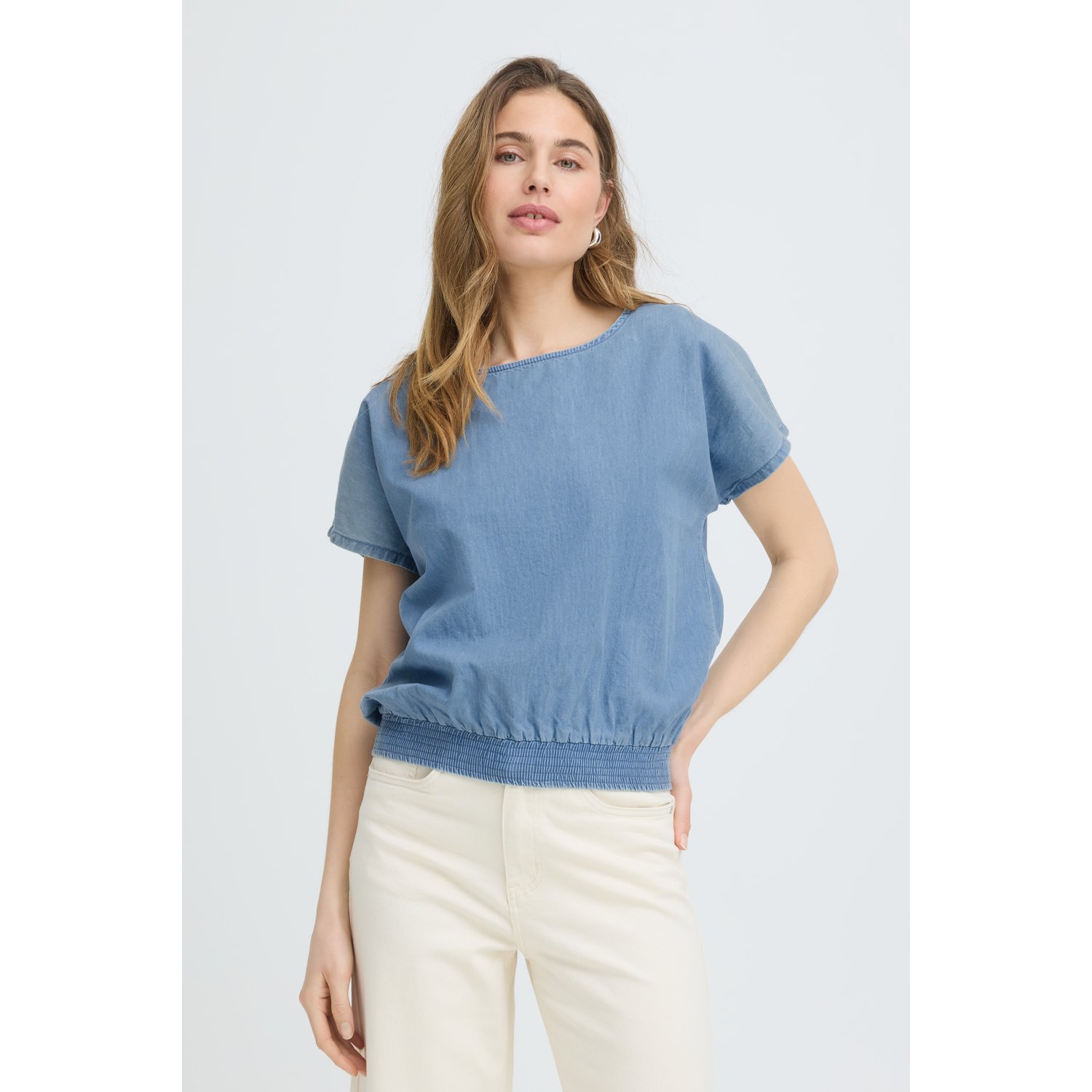 Materiaal: 100% katoen Lengte: kort Pasvorm: loose fit Wasvoorschrift: 30°C fijnwas Omschrijving: De Pulz PZJill SS Blouse Top is een luchtige en vrouwelijke top van soepele katoen kwaliteit. Dit model heeft korte mouwen, een loose fit en een elastische boord waardoor de top mooi blousend valt. De ritssluiting in de nek geeft een subtiel detail en maakt de top net even anders. Kleur fabrikant: light blue denim Sluiting: rits Halslijn: rond Mouwlengte: korte mouwen