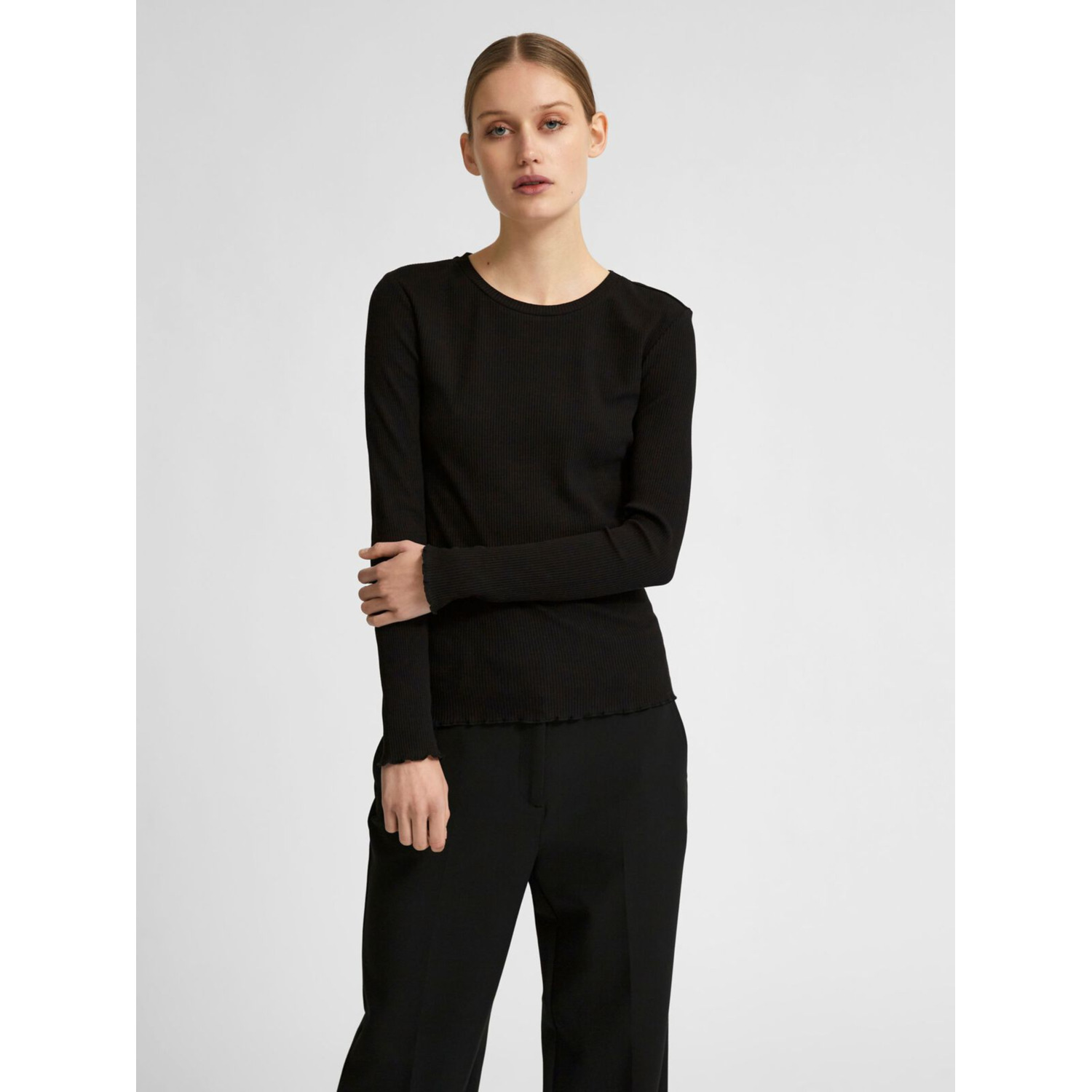 Materiaal: 95% katoen, 5% elastaan Lengte: normaal Pasvorm: tight fit Wasvoorschrift: 40°C, drogen in de droger op lage temperatuur Bijzonderheden: ribdetail Halslijn: ronde hals Mouwlengte: lange mouwen Lichaamslengte model: het model is 177 cm lang en draagt maat S/36.