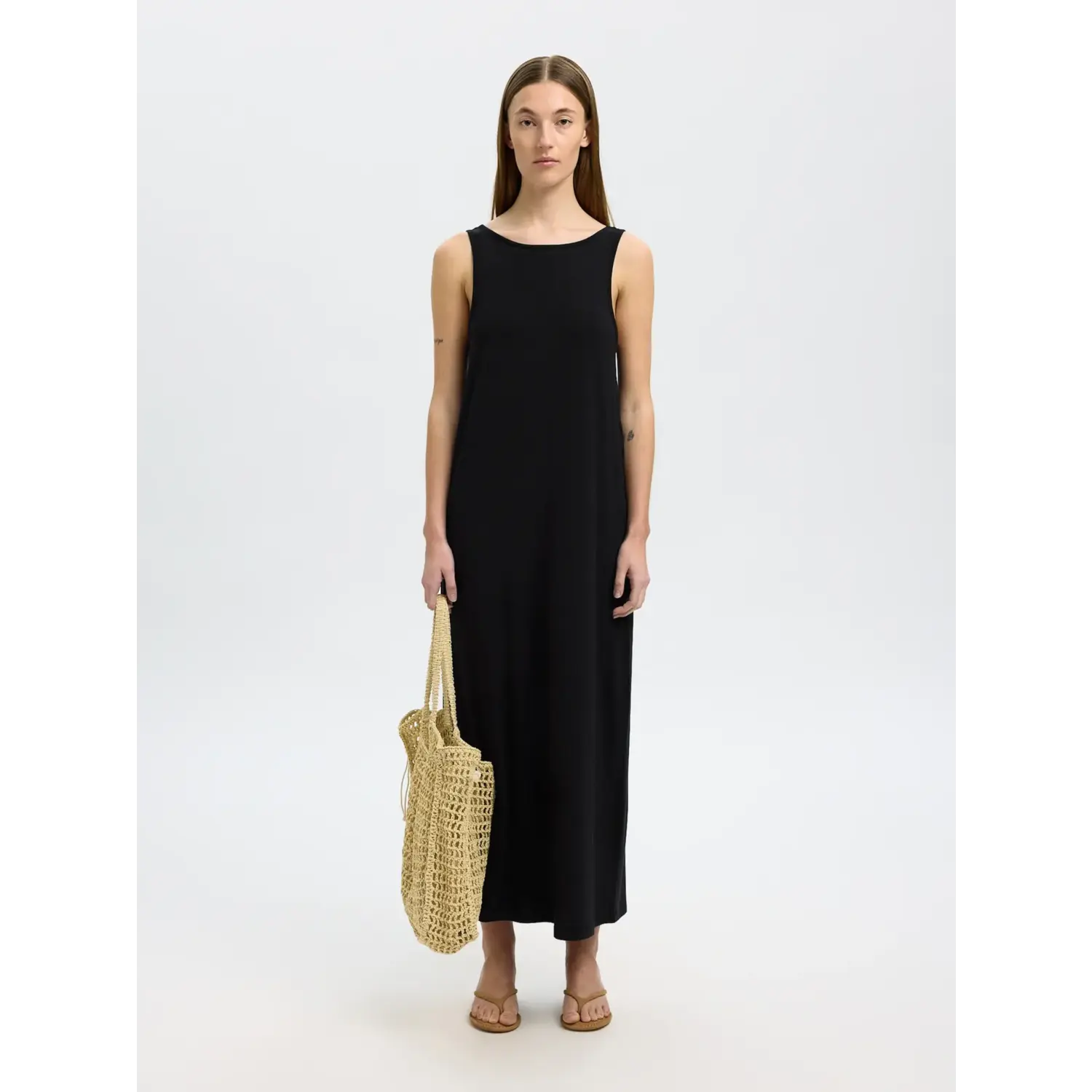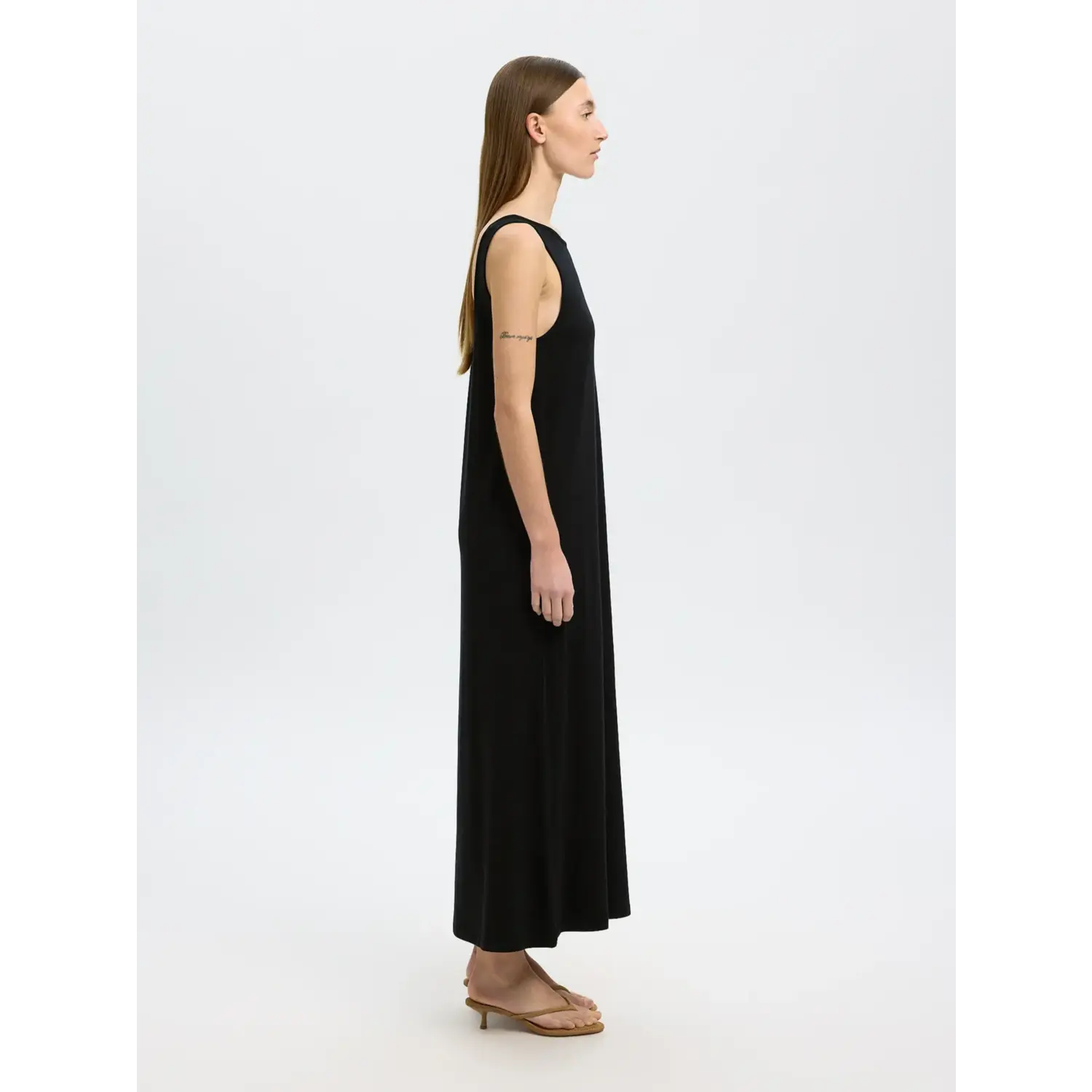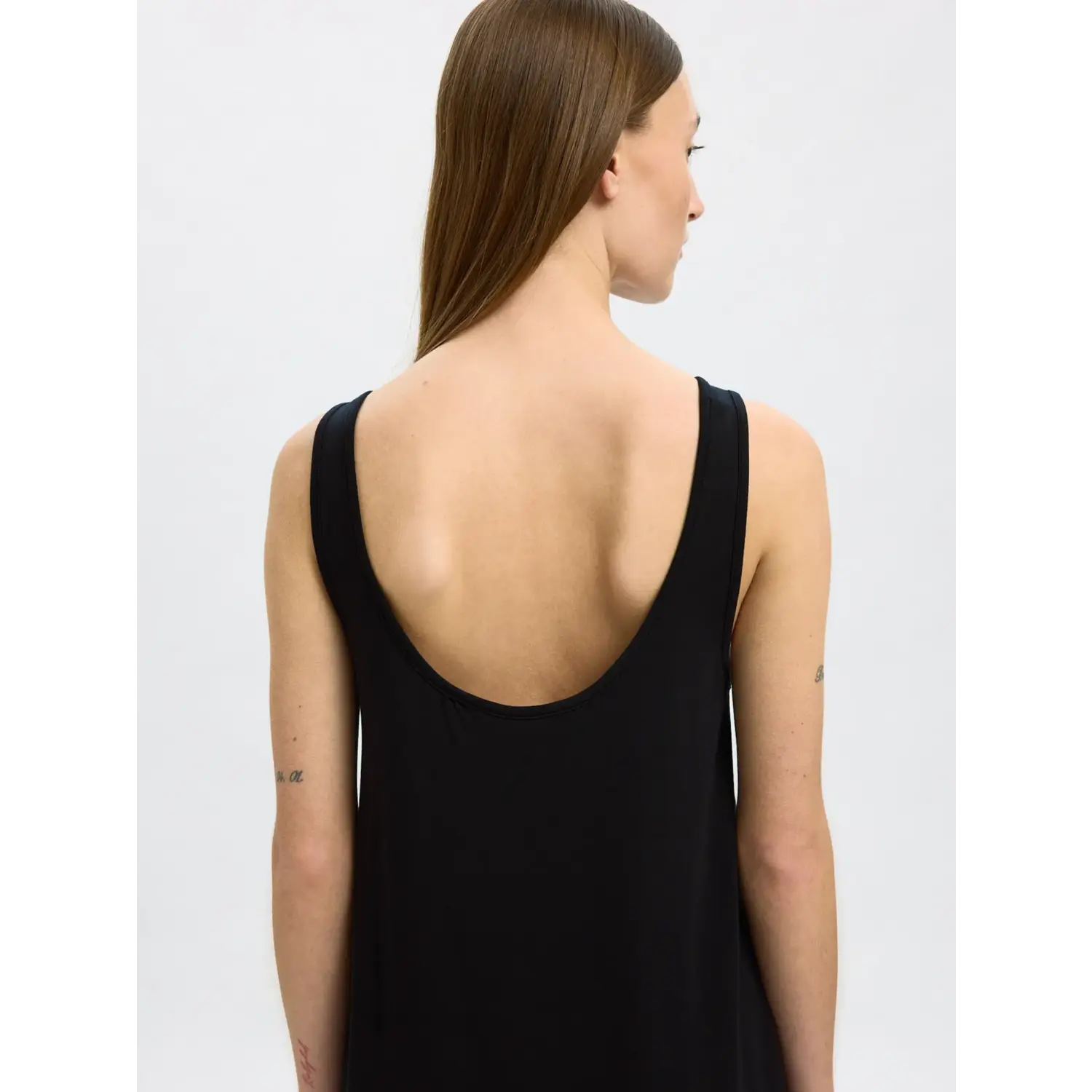 Materiaal: 50% Cotton - Organic, 46% Modal, 4% Elastane Lengte: lange lengte Pasvorm: regular fit Wasvoorschrift: 30°C fijnwas Bijzonderheden: soepele luchtige lange jurk van selected femme met een lage rug. Er zit een centuur bij om eventueel de taile te accentueren Kleur fabrikant: black Halslijn: ronde hals Mouwlengte: mouwloos
