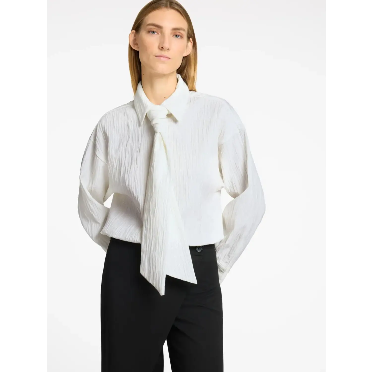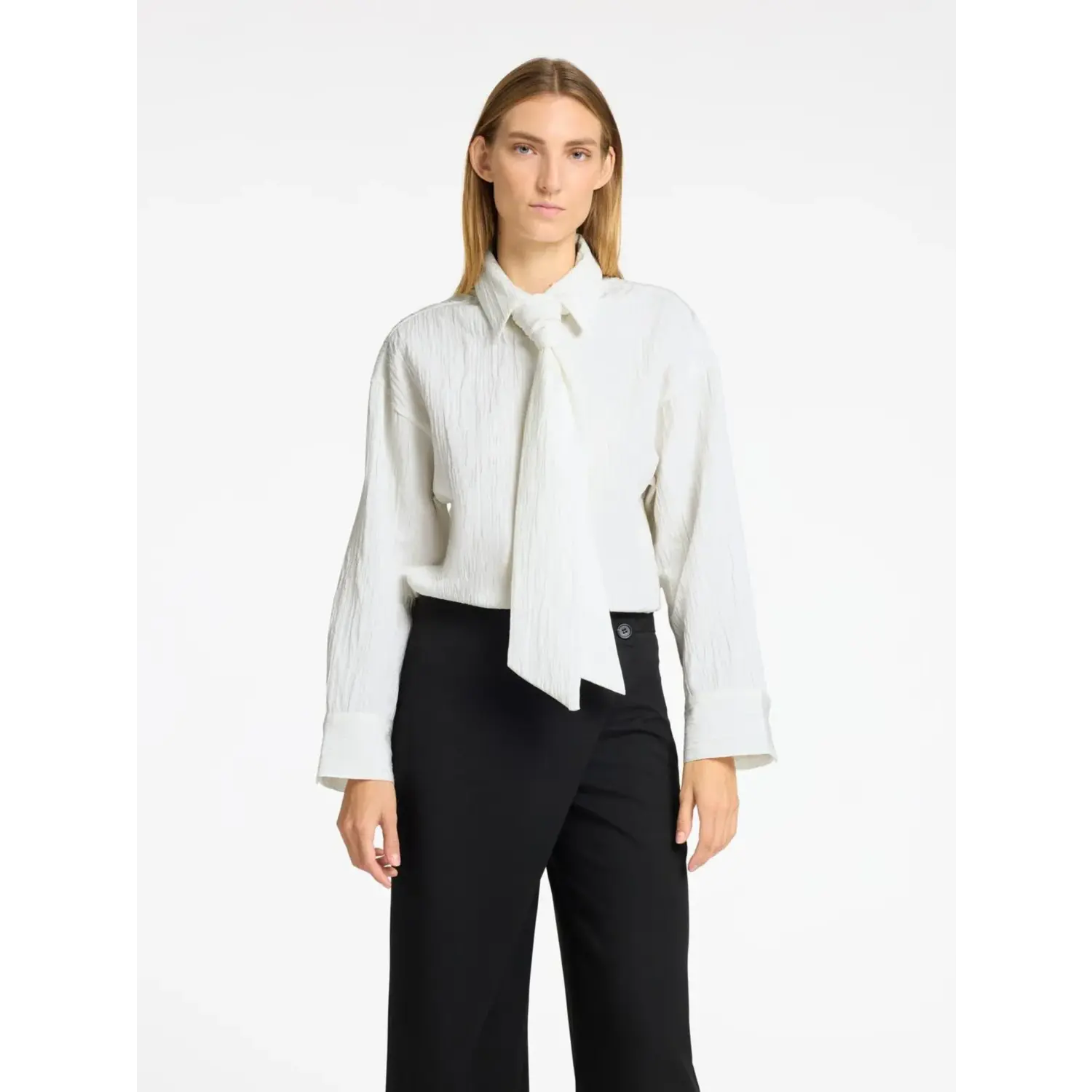 Materiaal: 58% Polyester - Recycled, 42% Cotton Lengte: normale lengte Pasvorm: regular fit Wasvoorschrift: 30°C fijnwas Bijzonderheden: prachtige blouse van zwarte kwaliteit. de strik kan er ook af, zit vast dmv een knoopje aan de achterzijde vd kraag. Ook stoer om met een jeans te combineren Kleur leverancier snow white Halslijn: kraag Mouwlengte: lange mouwen Sluiting: knopen