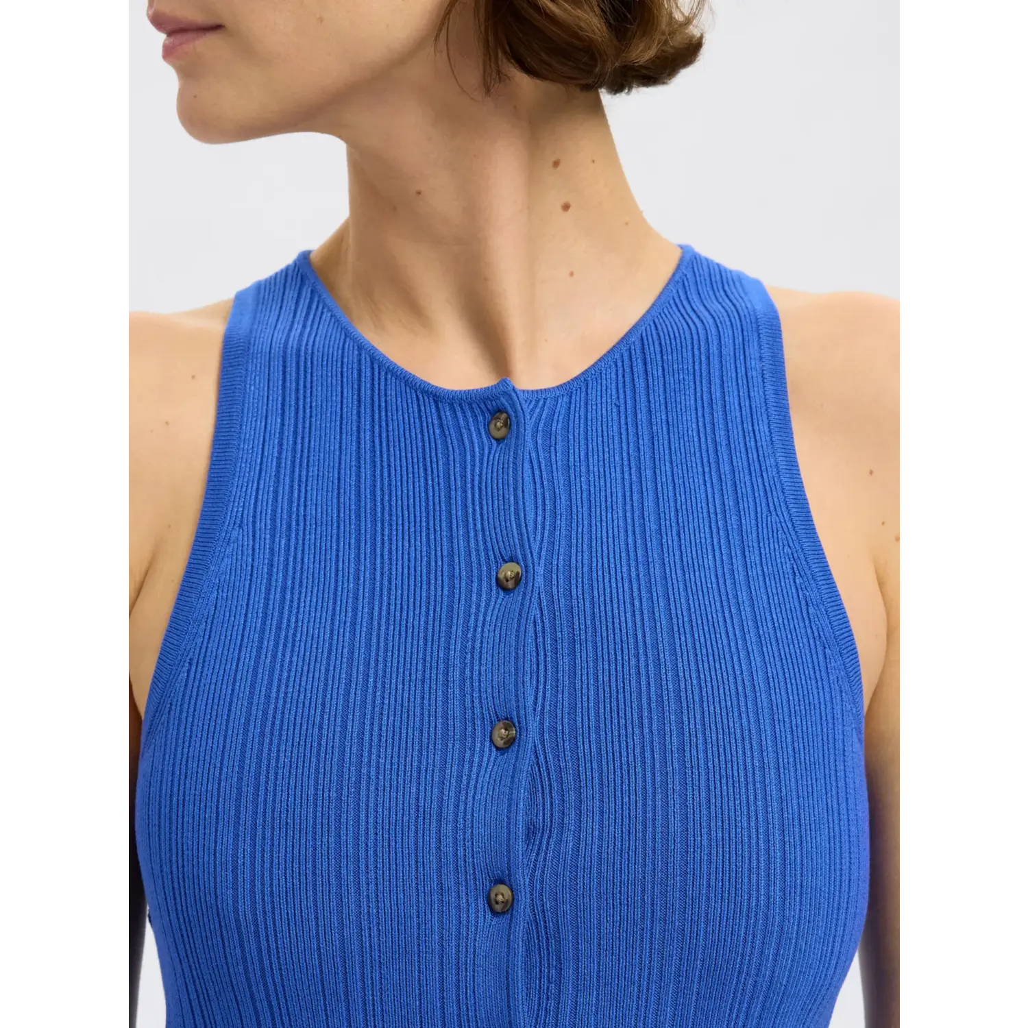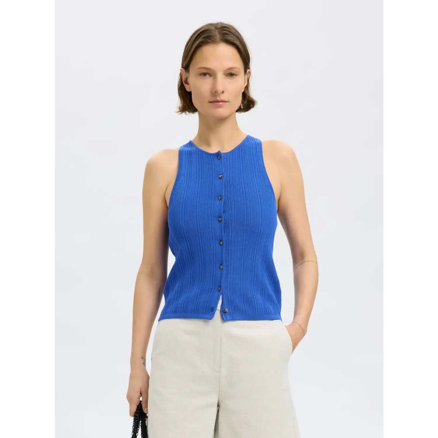 Materiaal: 91% Viscose LENZING™ECOVERO™, 9% Nylon Lengte: normale lengte Pasvorm: regular fit Wasvoorschrift: 30°C fijnwas Bijzonderheden: de trixie top is een zomerse top in het model van een tanktop. De knoopjs kunnen open, waardoor je een speels efeect krijgt bij de hals of taille Kleur fabrikant: dazzling blue Halslijn: ronde hals Mouwlengte: mouwloos Sluiting: knoopjes
