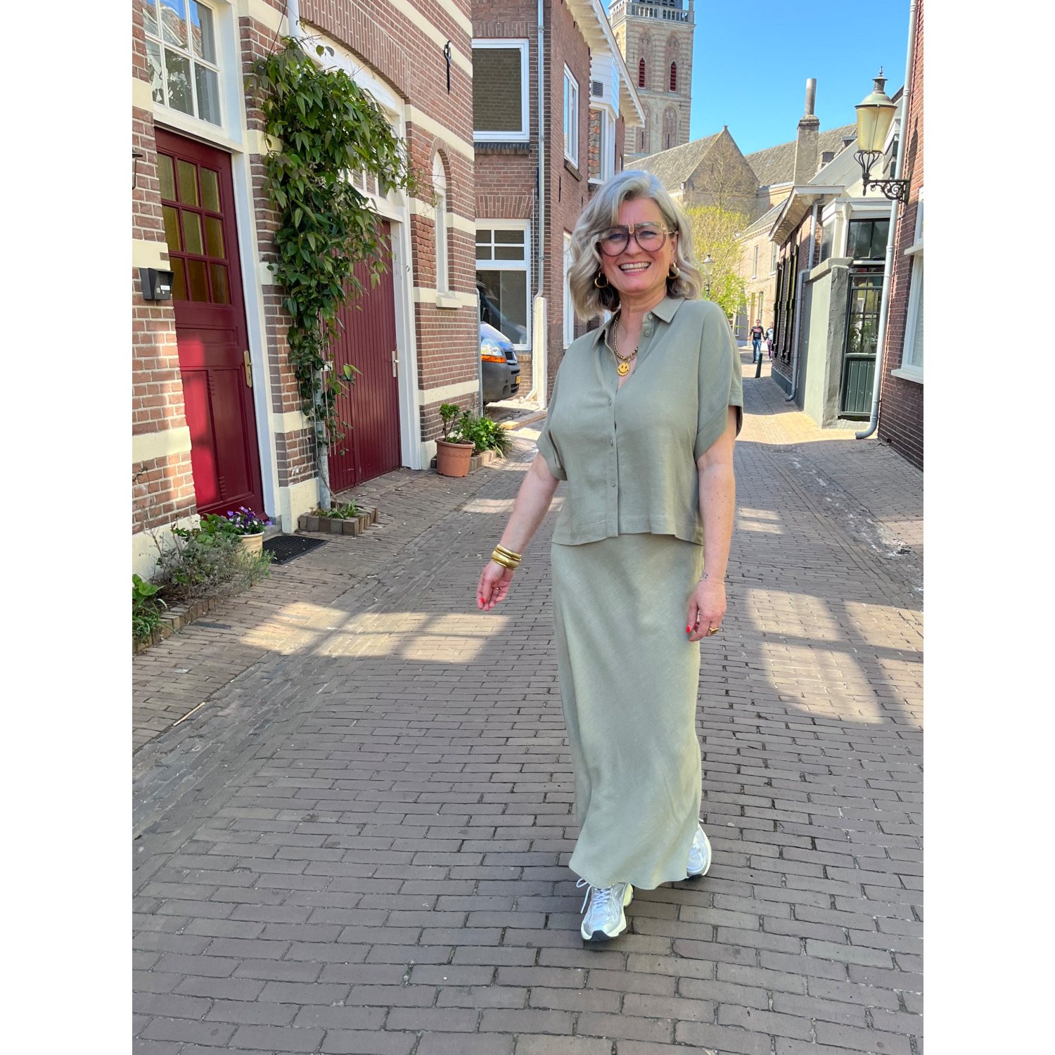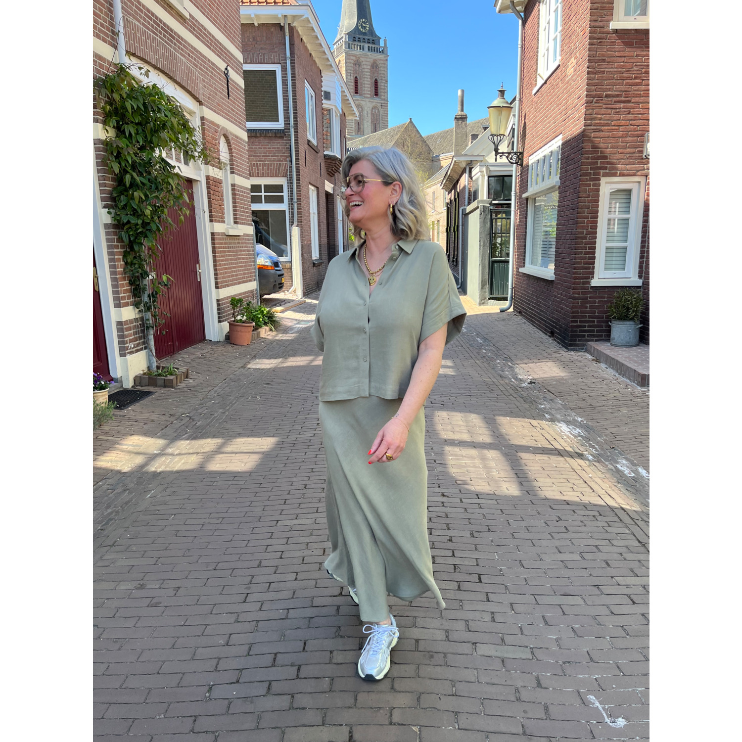 Materiaal: 85% Viscose LENZING™ECOVERO™, 15% Linen Lengte: enkel lengte Pasvorm: aansluitend bij de heup, daarna licht uitlopend Wasvoorschrift: 30°C fijnwas Bijzonderheden: deze luchtige viscose linnen mix rok is één van de items uit de Viva lijn van selected femme. Heerlijk luchtig materiaal en allemaal met elkaar te combineren. Kleur fabrikant: vetiver