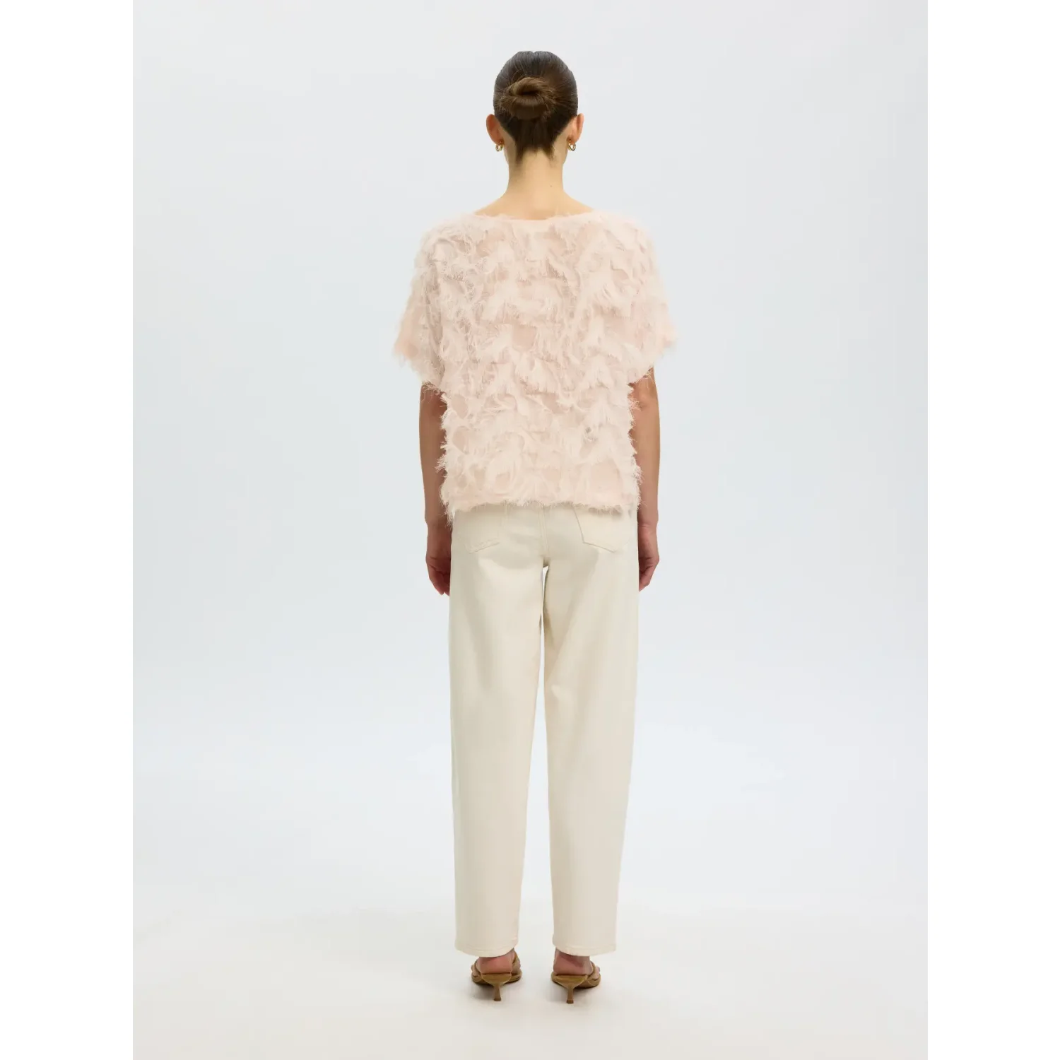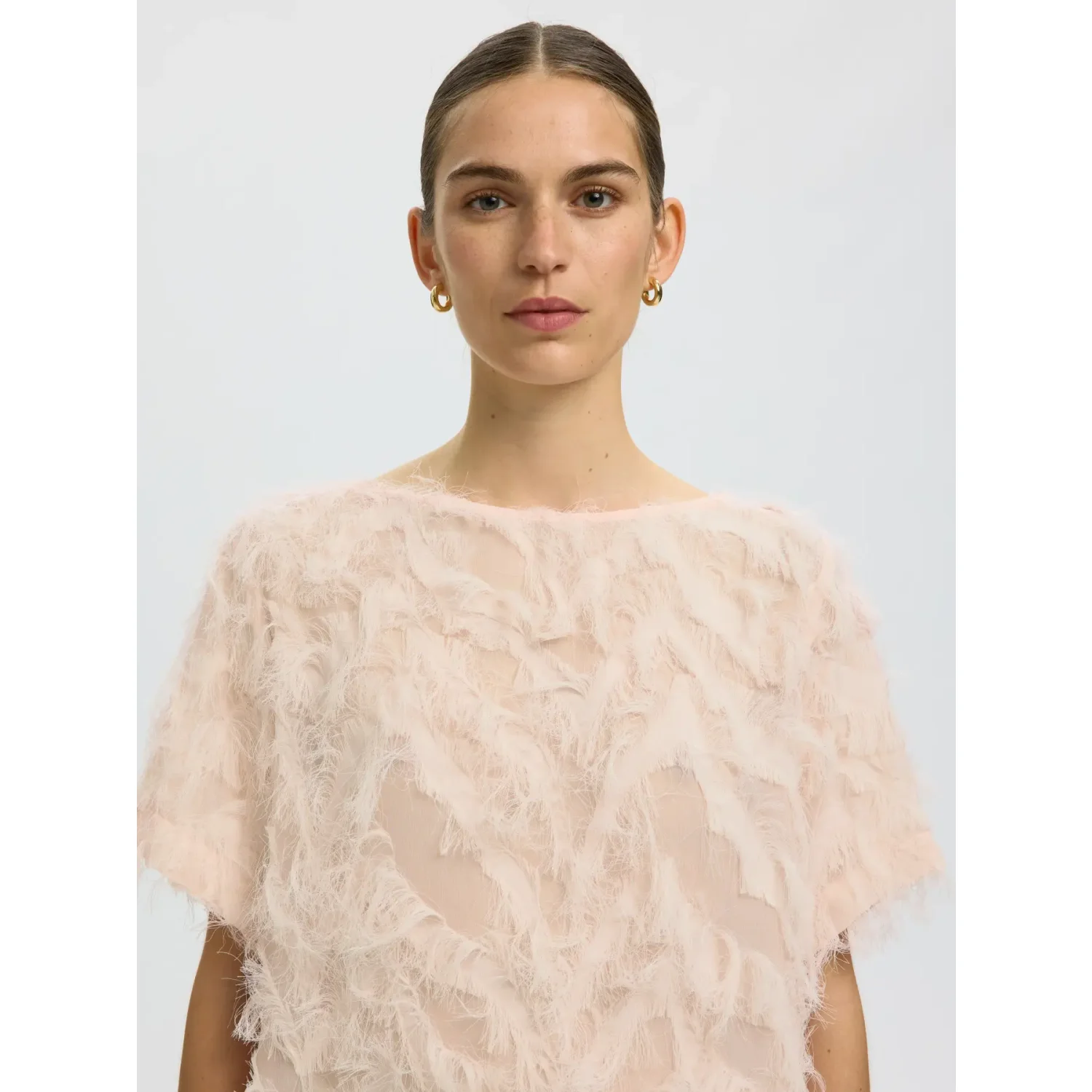 Omschrijving: De Selected Femme SLFMyline SS Boat Neck Top is een verfijnde en vrouwelijke top met een luxe uitstraling. Deze lichtroze, transparante top heeft een subtiele mix van structuren en speelse rafeldetails in de stof, wat zorgt voor een chique en unieke look. De boothals, korte mouwen en relaxed fit met kortere lengte maken ‘m perfect voor zowel casual als geklede outfits.