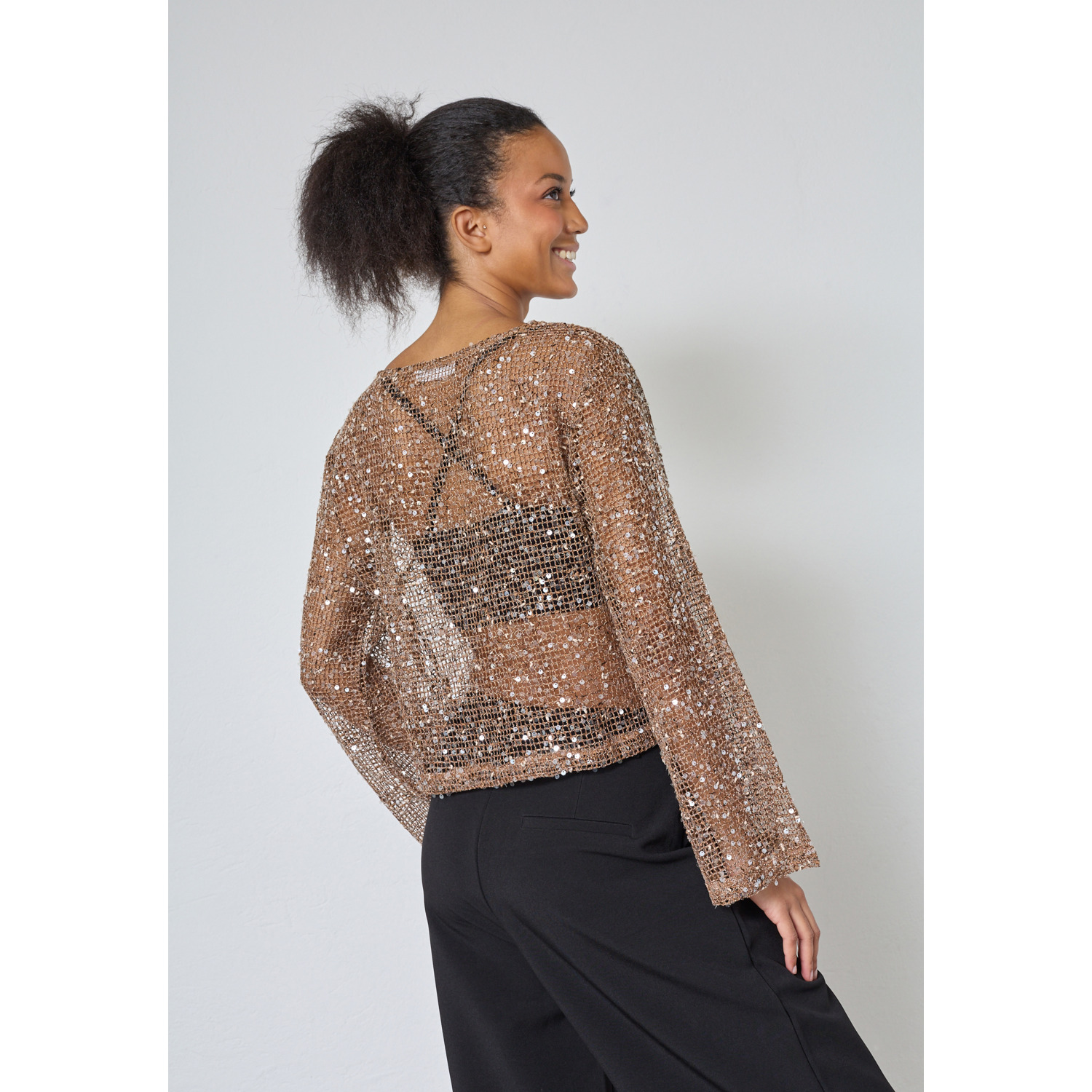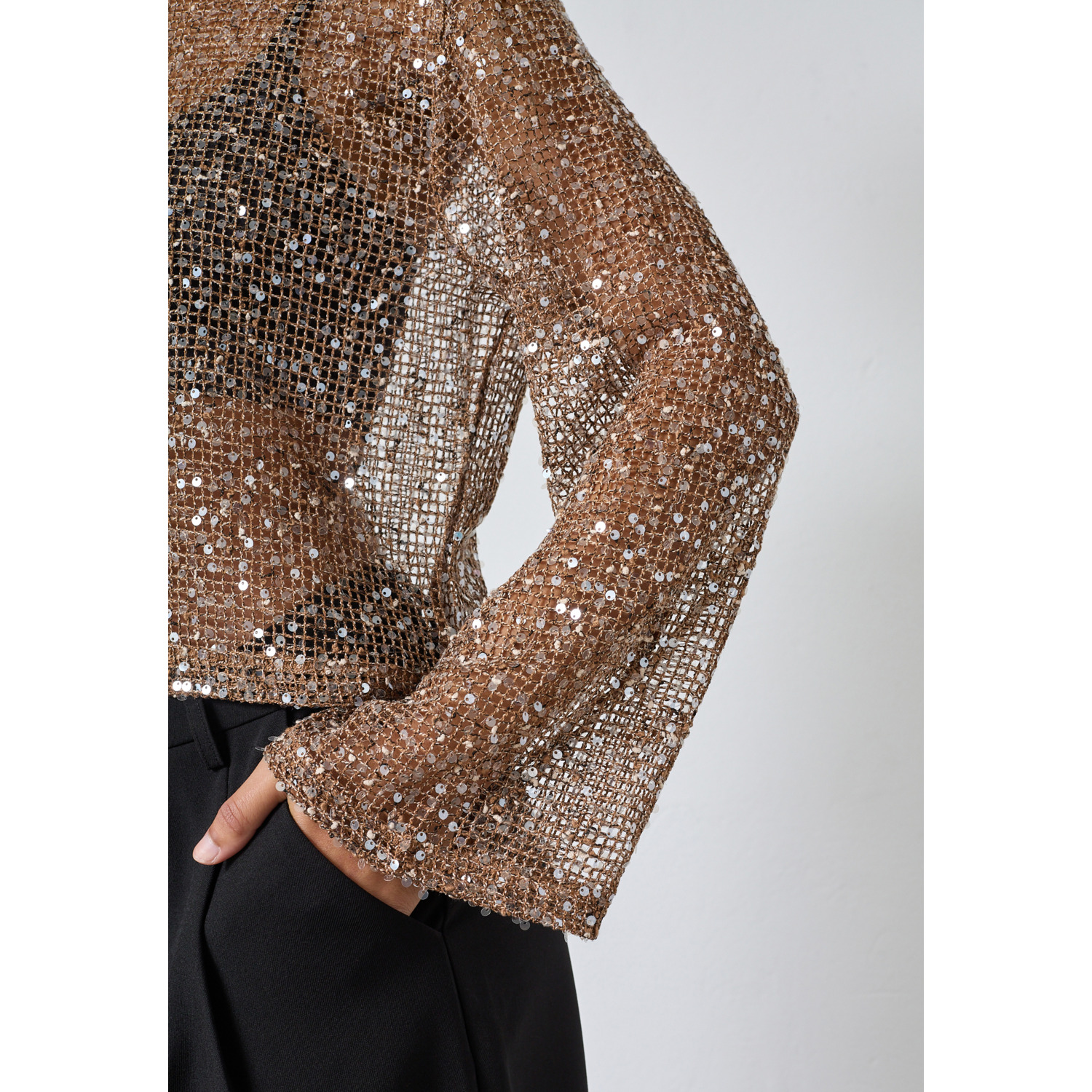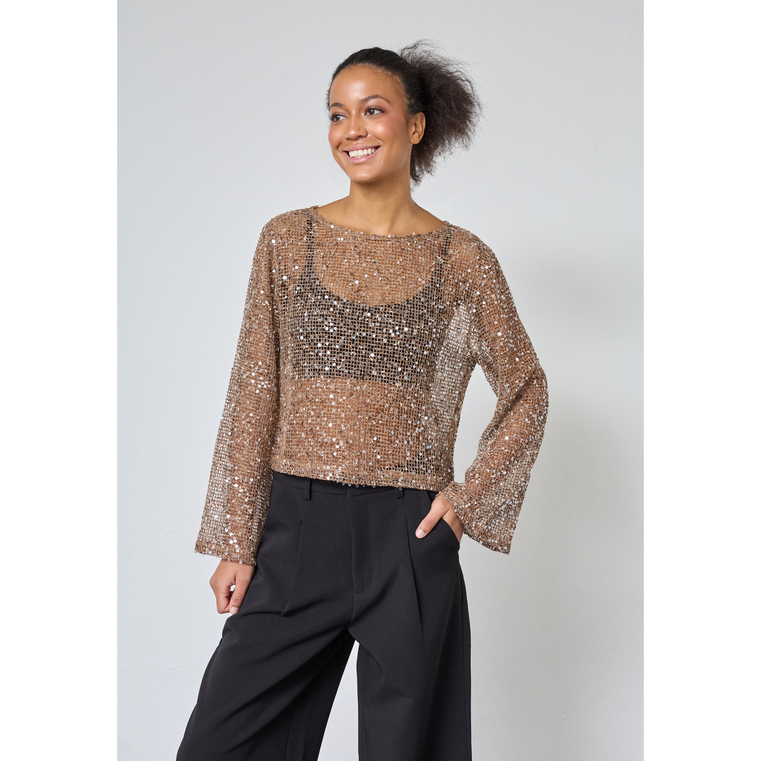 Materiaal: 100% polyester Lengte: cropped Pasvorm: loose fit Wasvoorschrift: 30°C fijnwas, waszakje Omschrijving: De Sisters Point Glisa Top is dé ultieme party-top! Deze cropped pailletten top is gemaakt van een luchtige glitter gaasstof en heeft uitlopende mouwen voor die perfecte dramatische feestlook. De pailletten vangen prachtig het licht, waardoor je direct straalt. Combineer met een hoge taille pantalon, rok of wide leg jeans voor een on-trend en glamoureuze outfit — klaar voor elke feestavond! Kleur fabrikant: brown glitter Halslijn: rond Mouwlengte: lange uitlopende mouwen