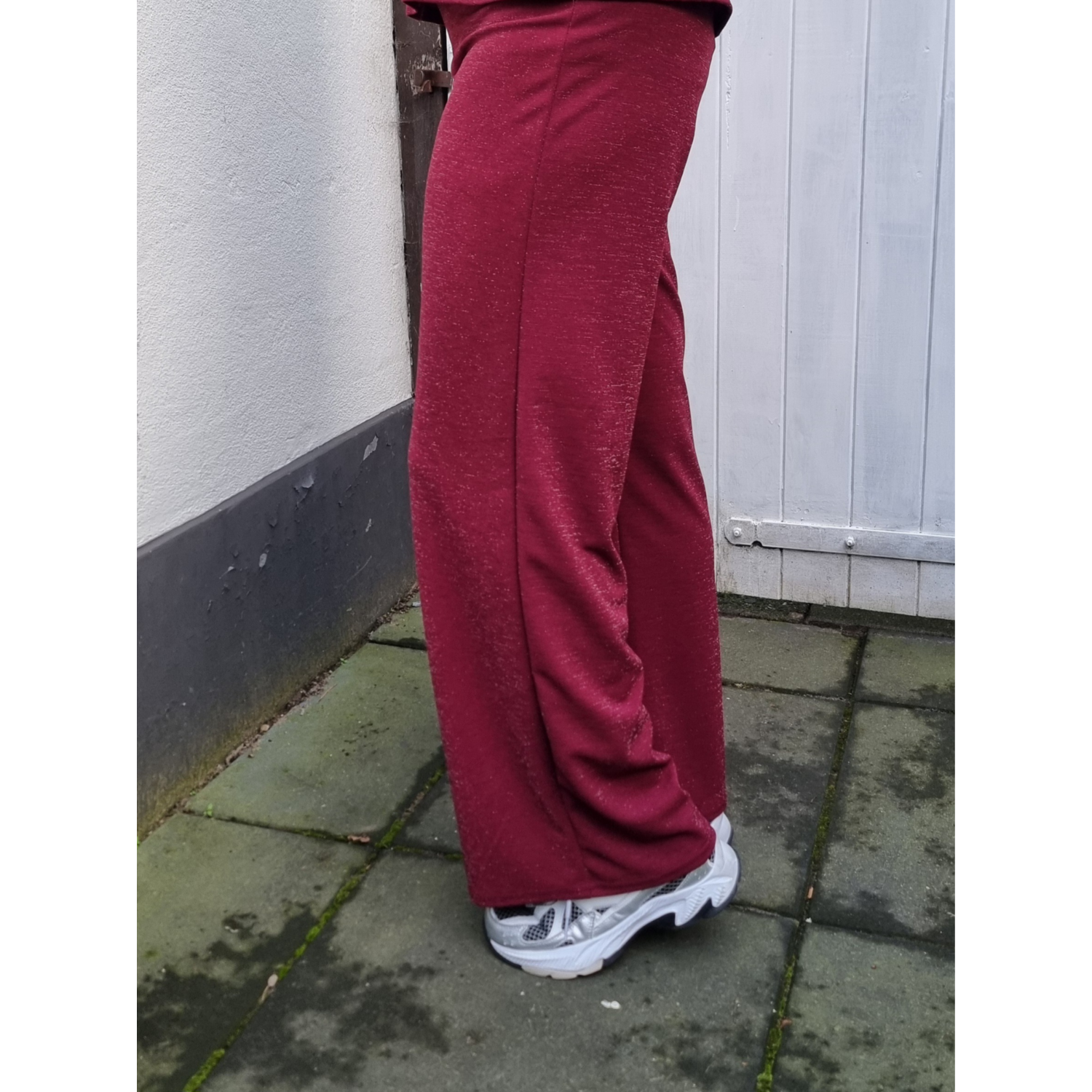 Materiaal: 88% Polyester 4%Elasthan 8%Metallic Lengte: lange lengte Pasvorm: wide fit Wasvoorschrift: 30°C fijnwas Bijzonderheden: glitter broek in de mooie burgundy kleur. de broek heeft een elastiche boord en is in combinatie met de bijpassende top een echte party outfit. Maar zeker ook tof in combinatie met een oversized sweater Kleur leverancier bordeaux silver Heuphoogte: high waist Broekzakken: geen