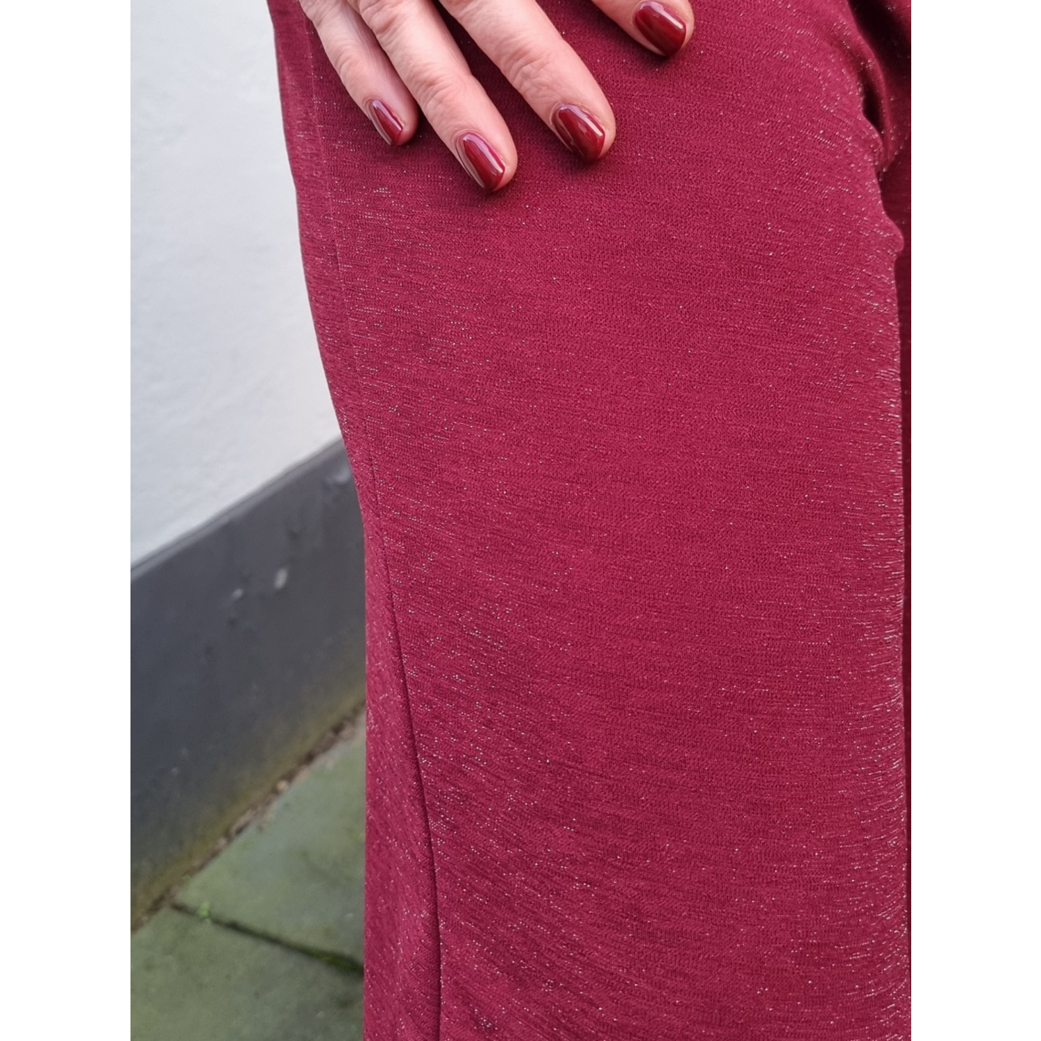 Bijzonderheden: glitter broek in de mooie burgundy kleur. de broek heeft een elastiche boord en is in combinatie met de bijpassende top een echte party outfit. Maar zeker ook tof in combinatie met een oversized sweater