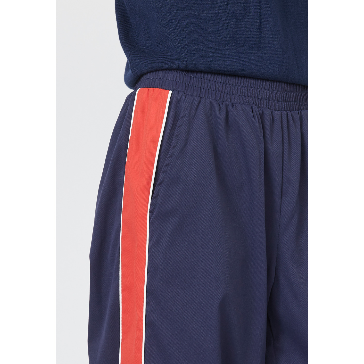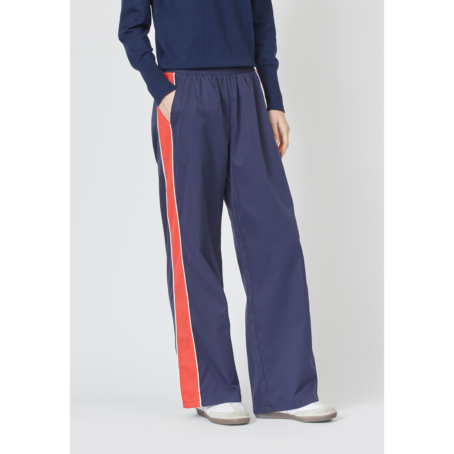 Materiaal: 100% polyester Lengte: lange lengte Pasvorm: straight fit Wasvoorschrift: 30°C fijnwas Bijzonderheden: helemaal de trend van nu, combineer de broek met een sweater of ga voor een stoer shirt met blazer Kleur fabrikant: navy/ruby Sluiting: elastische boord Heuphoogte: normaal Broekzakken: steekzakken